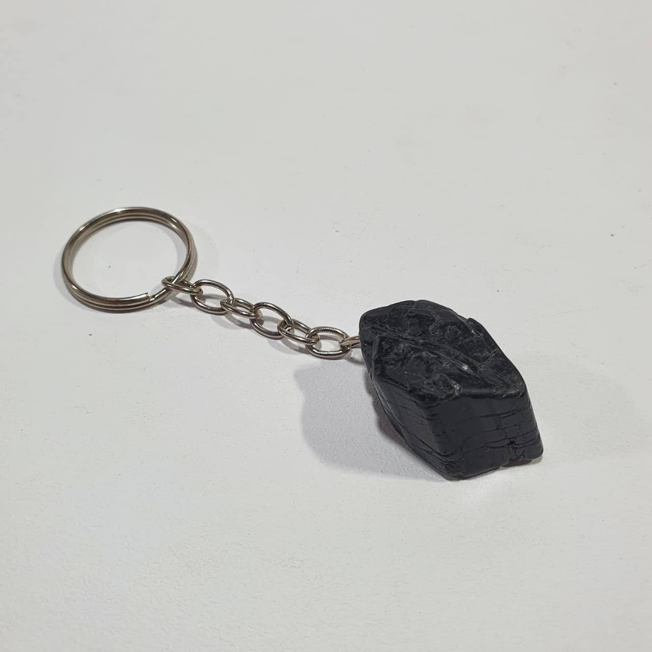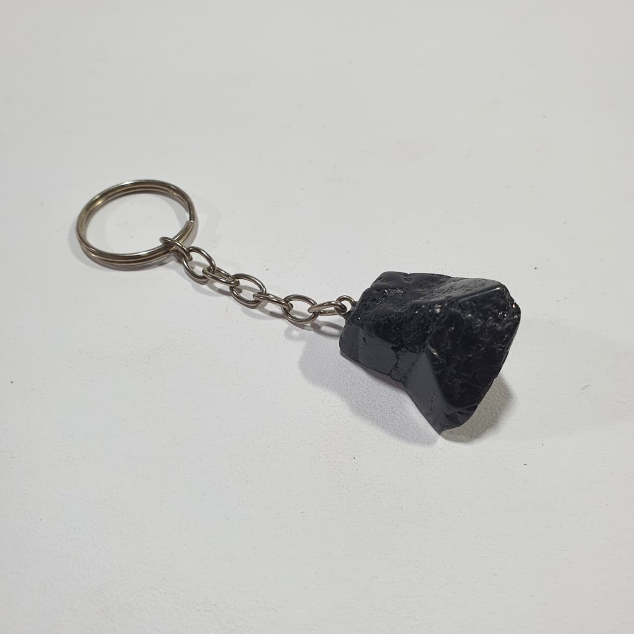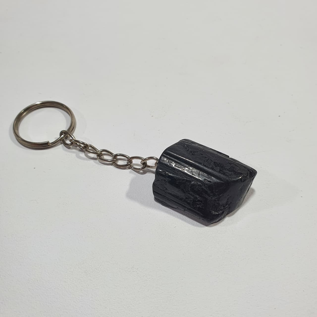 Black Tourmaline, scientifically known as schorl, is an aluminum borosilicate mineral rich in iron. It forms in igneous and metamorphic environments, often within pegmatites, where slow crystallization allows elongated, columnar crystals to develop. The stones used for these keychains are finished through the tumbling process, where rough fragments are placed in rotary barrels with abrasives and water. Continuous movement smooths sharp edges, rounds shapes, and enhances the polish, giving each piece a glossy, tactile surface.