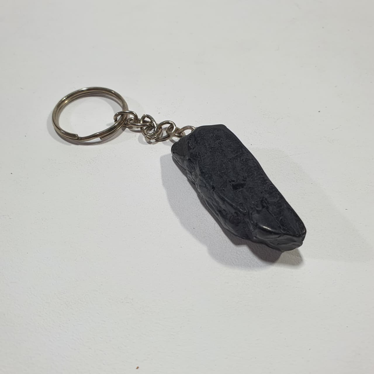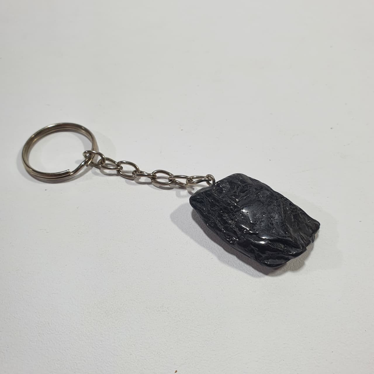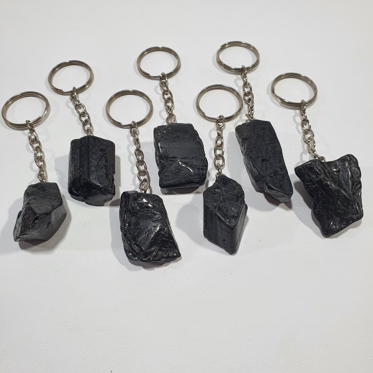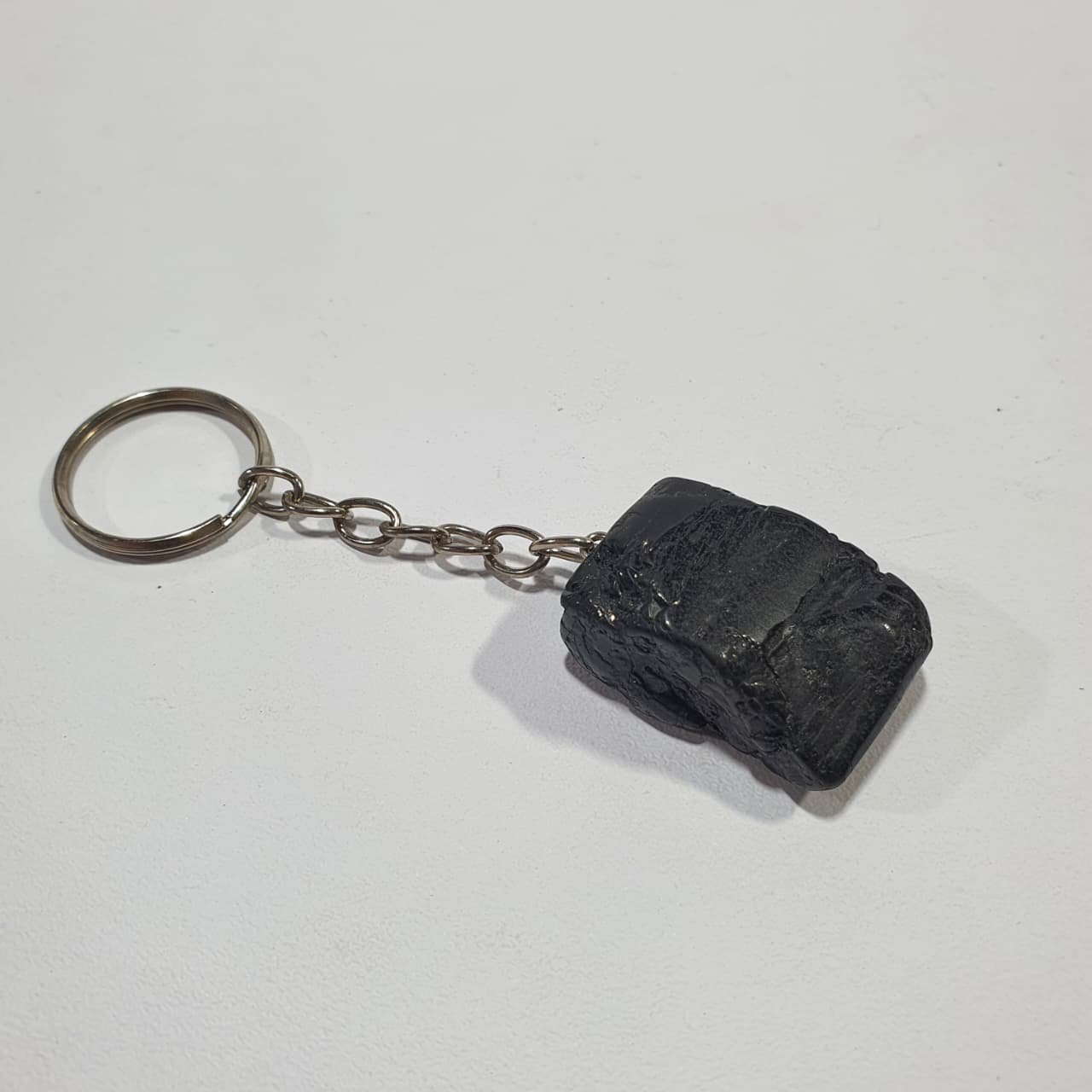 Black Tourmaline, scientifically known as schorl, is an aluminum borosilicate mineral rich in iron. It forms in igneous and metamorphic environments, often within pegmatites, where slow crystallization allows elongated, columnar crystals to develop. The stones used for these keychains are finished through the tumbling process, where rough fragments are placed in rotary barrels with abrasives and water. Continuous movement smooths sharp edges, rounds shapes, and enhances the polish, giving each piece a glossy, tactile surface.