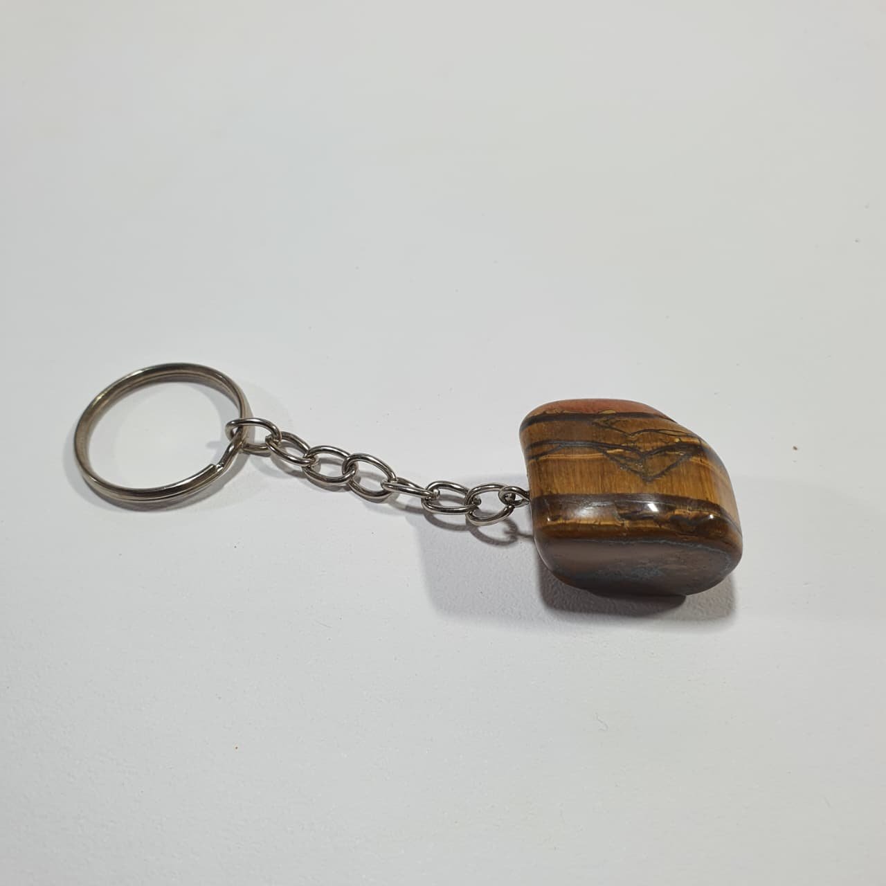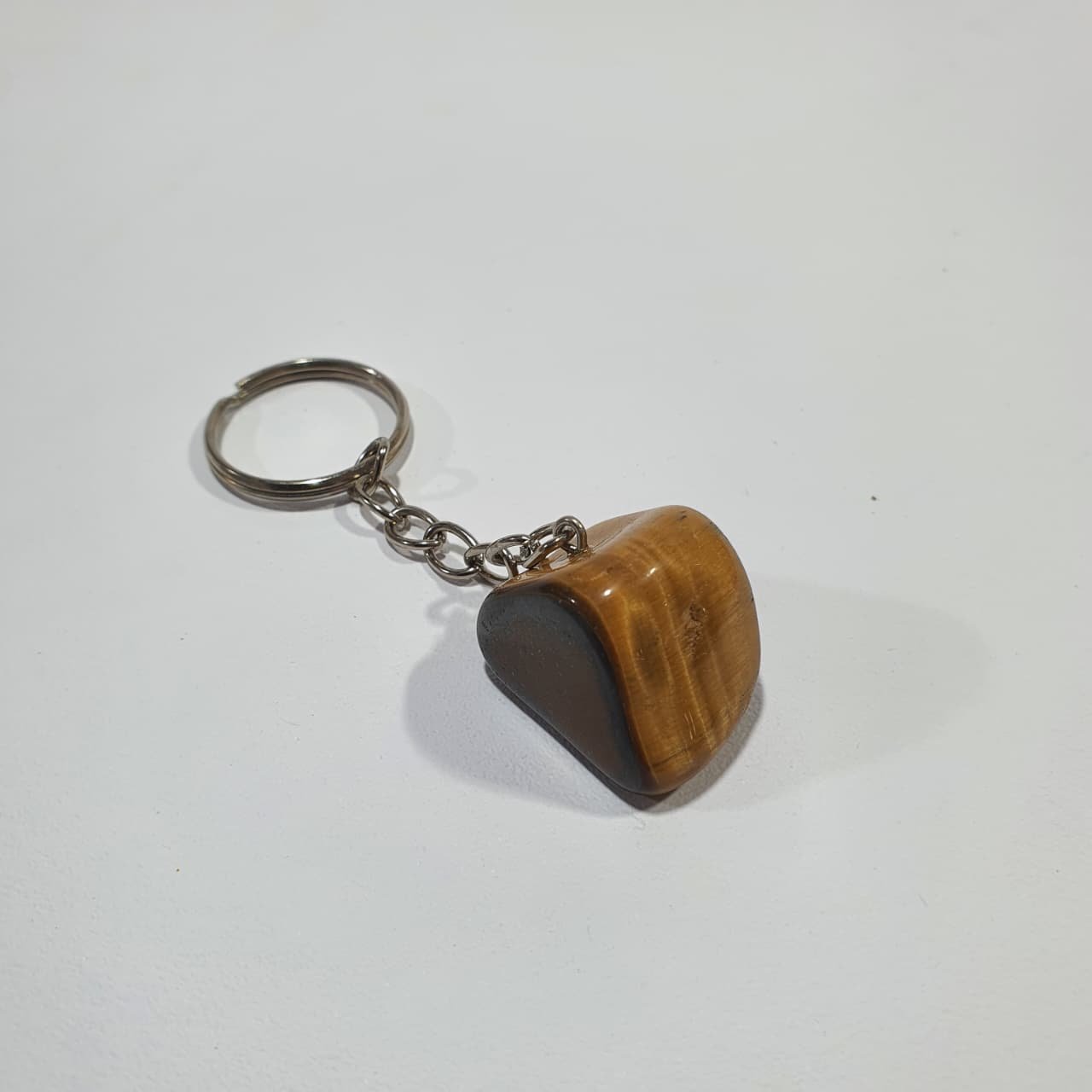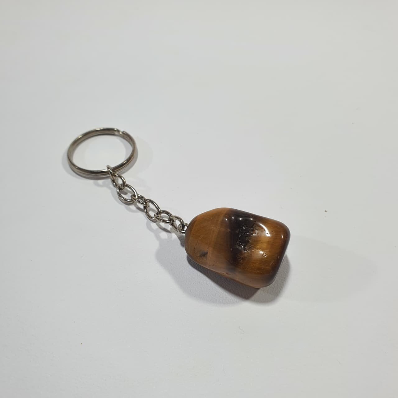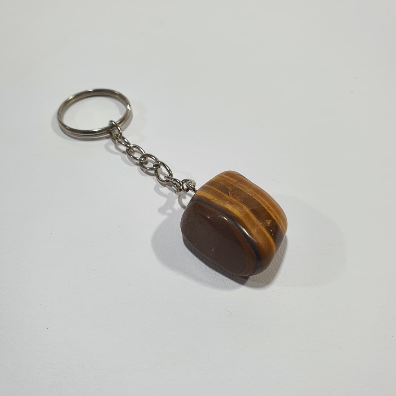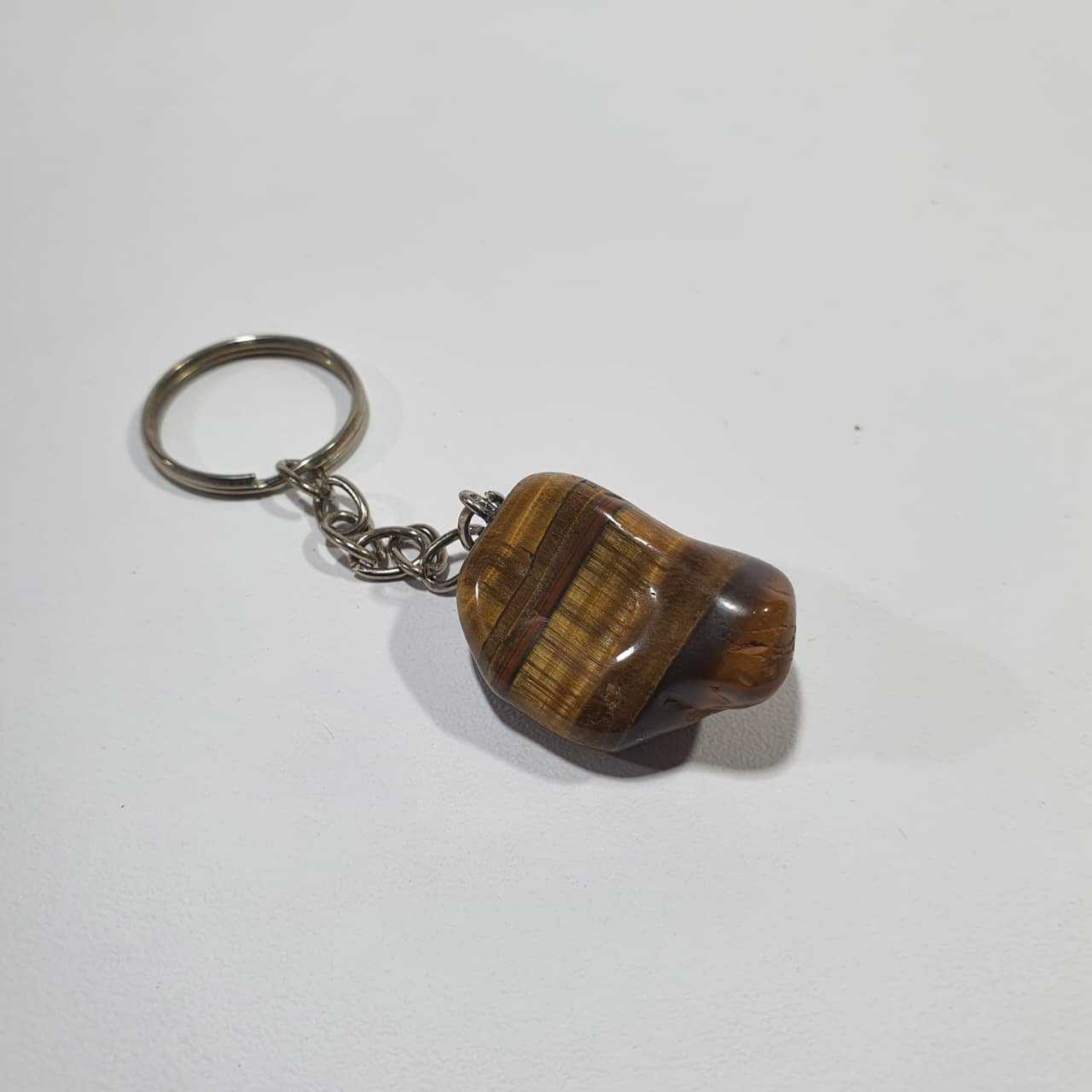 Tiger’s Eye is a metamorphic variety of quartz (SiO₂) formed when crocidolite fibers are gradually replaced by silica while retaining the fibrous structure. This process, combined with iron oxide staining, creates the characteristic golden-brown bands and shimmering optical effect known as chatoyance. For keychains, the rough material is refined through the tumbling process: stones are rotated in barrels with abrasives and water, smoothing rough edges, rounding forms, and enhancing the natural polish and luster.