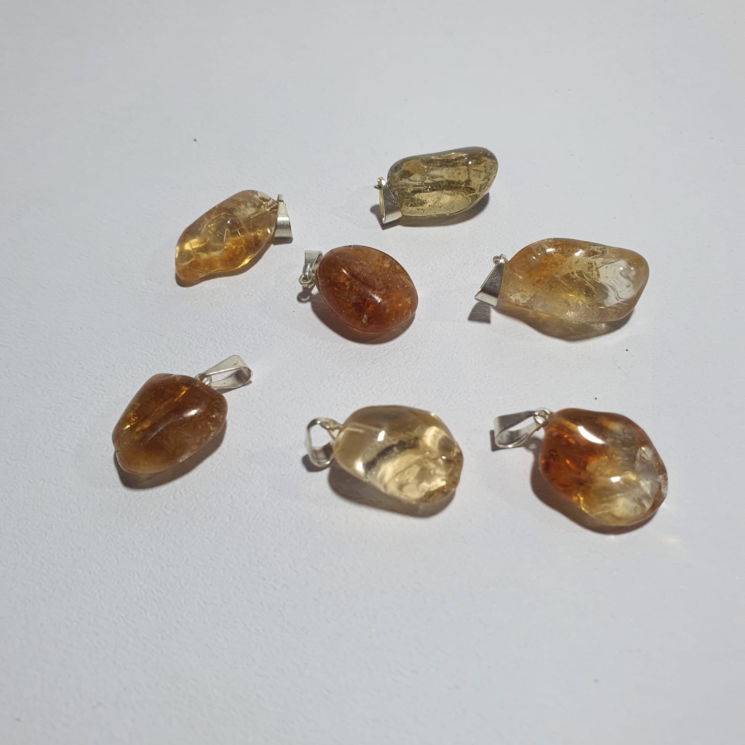 Tumbled Citrine pendants with warm tones ranging from pale yellow to deep golden. The smooth, rounded surfaces highlight the stone’s natural luster, making each pendant exclusive. Sold in wholesale packs of 25 units, perfect for jewelry, crafts, decoration, and resale.