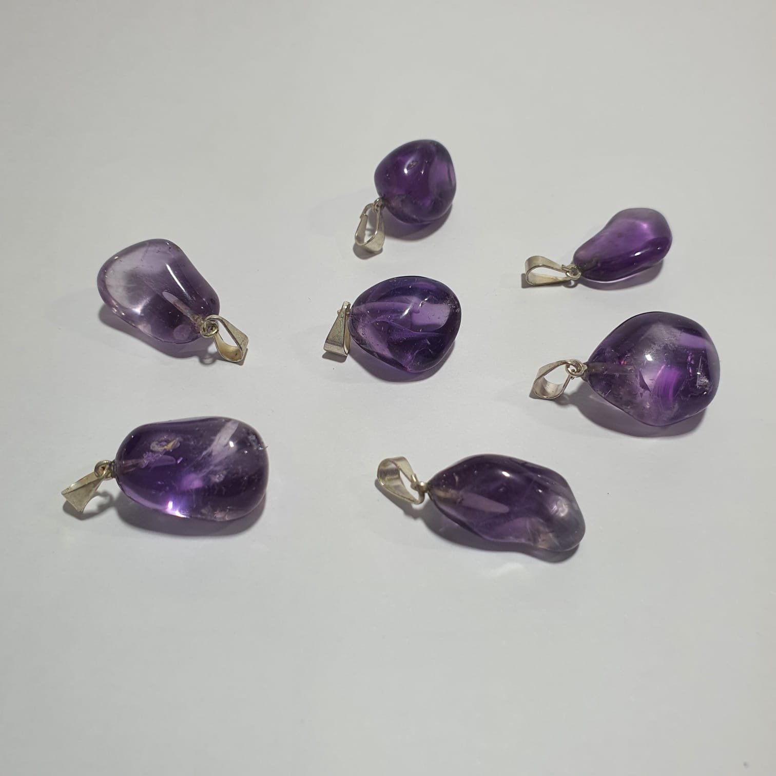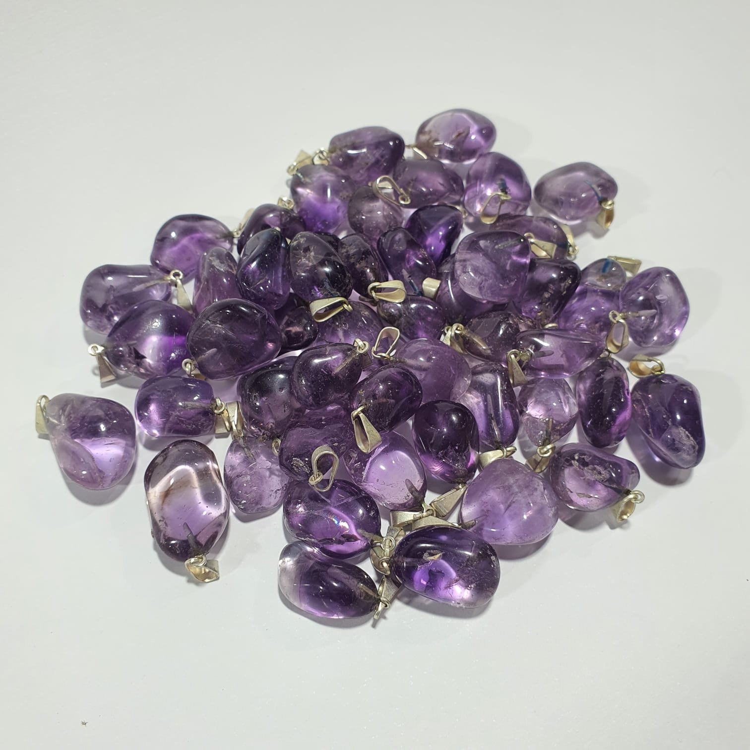 Tumbled Amethyst pendants with a smooth, polished finish that highlights their natural shades of violet and lavender. Each piece is unique in color and shape, making it a refined option for jewelry collections and wholesale resale. Sold in wholesale packs of 25 units.