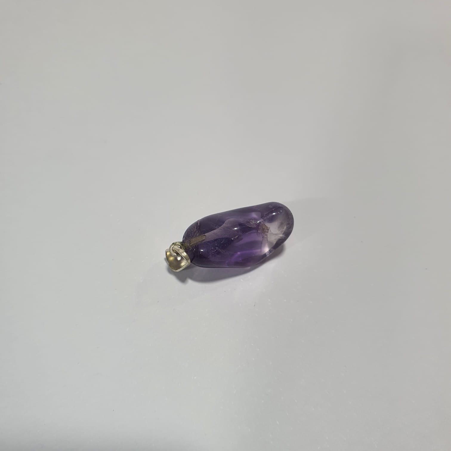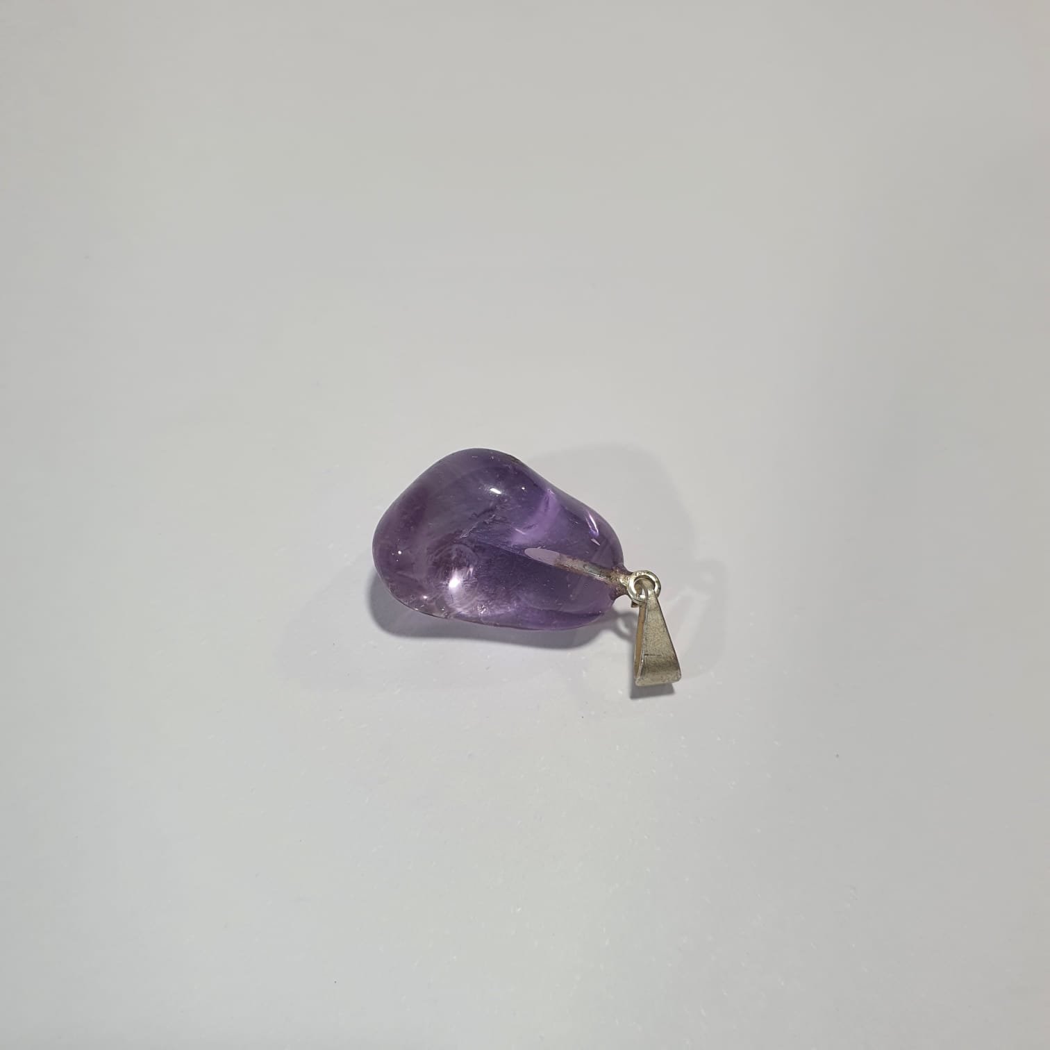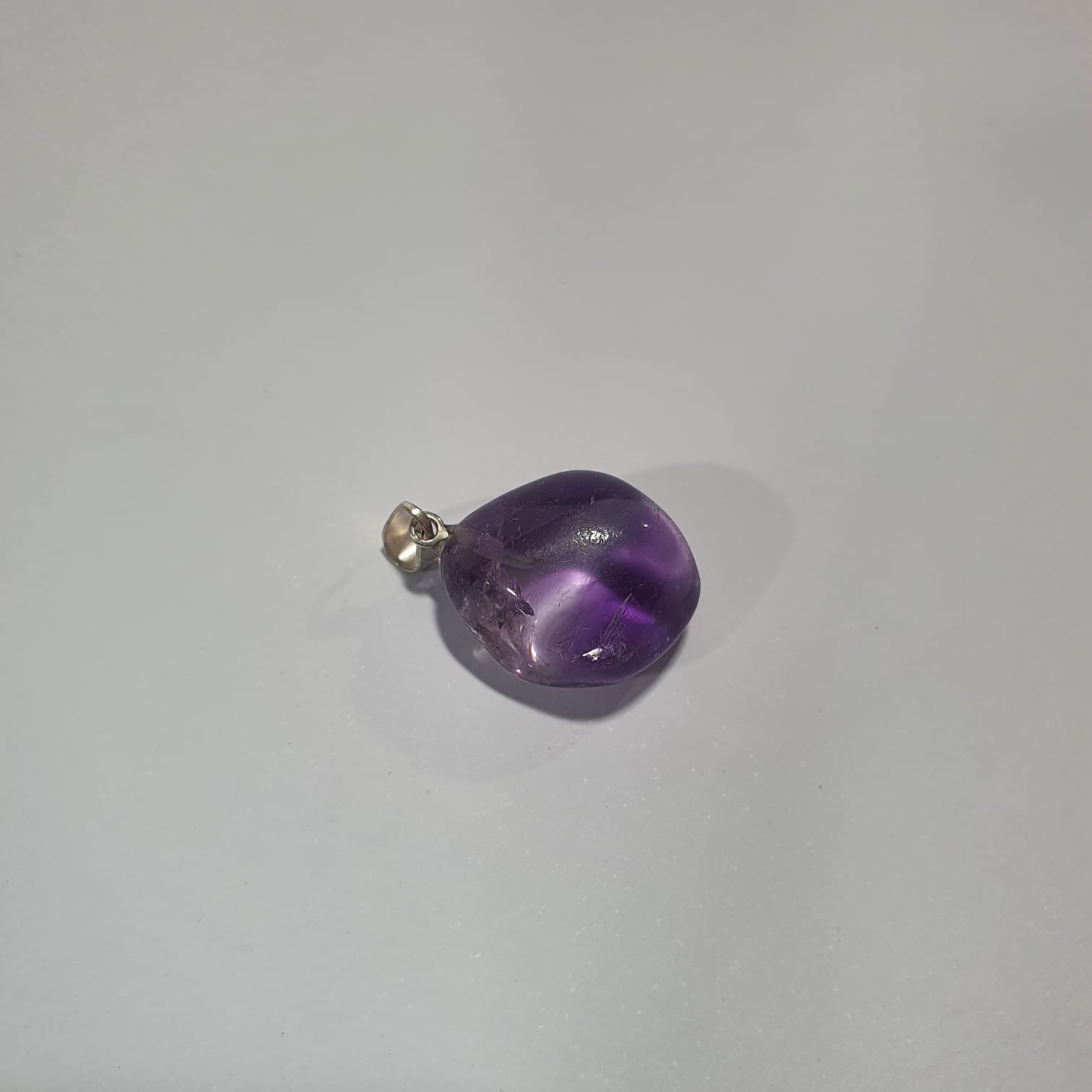 Amethyst is a purple variety of quartz (SiO₂), formed in geodes and cavities of volcanic rocks, where silica-rich fluids crystallize under specific temperature and pressure conditions. Its characteristic violet tones result from traces of iron and natural radiation. In this pendant version, the stones go through a tumbling process, where rough pieces are placed in rotary barrels with abrasives and water. This technique polishes and rounds the surfaces, enhancing luster and emphasizing the gemstone’s natural beauty.