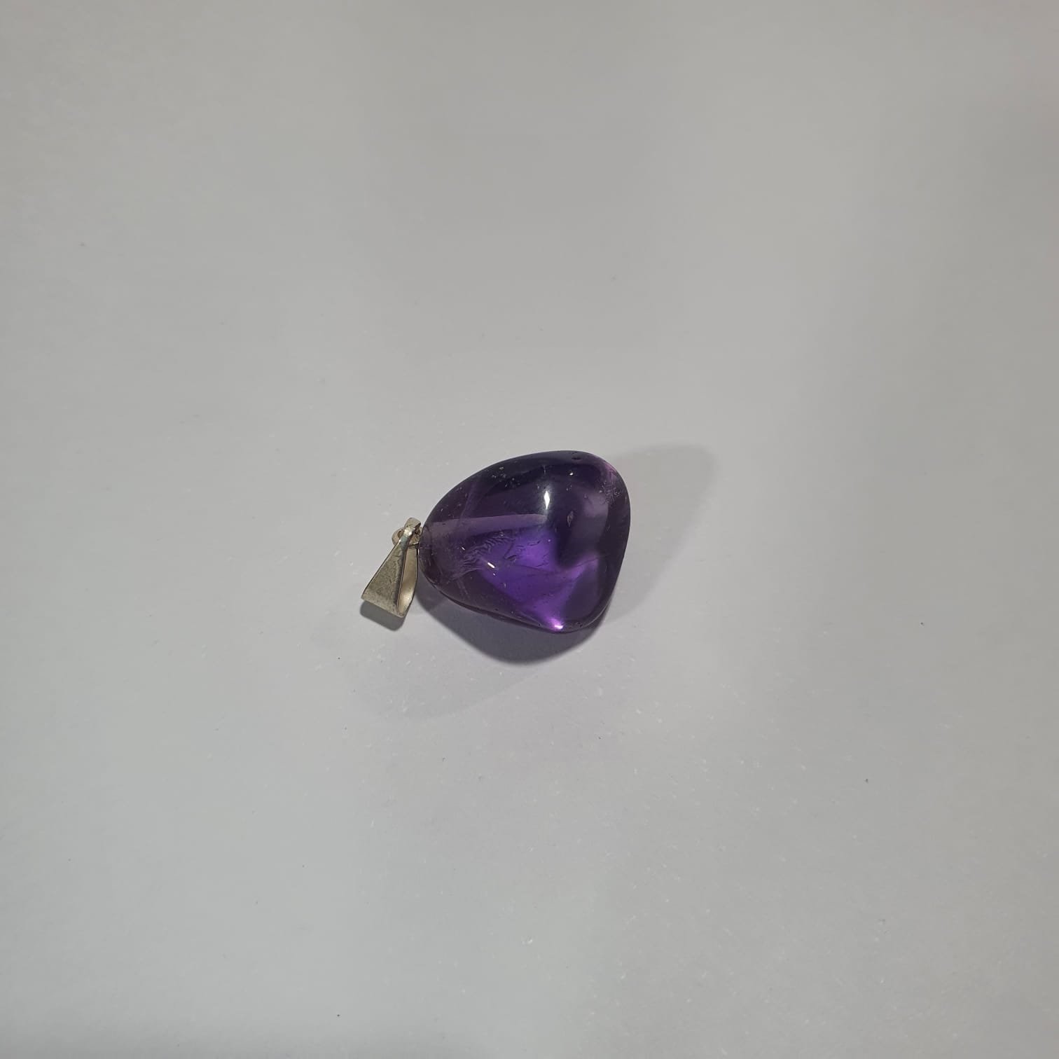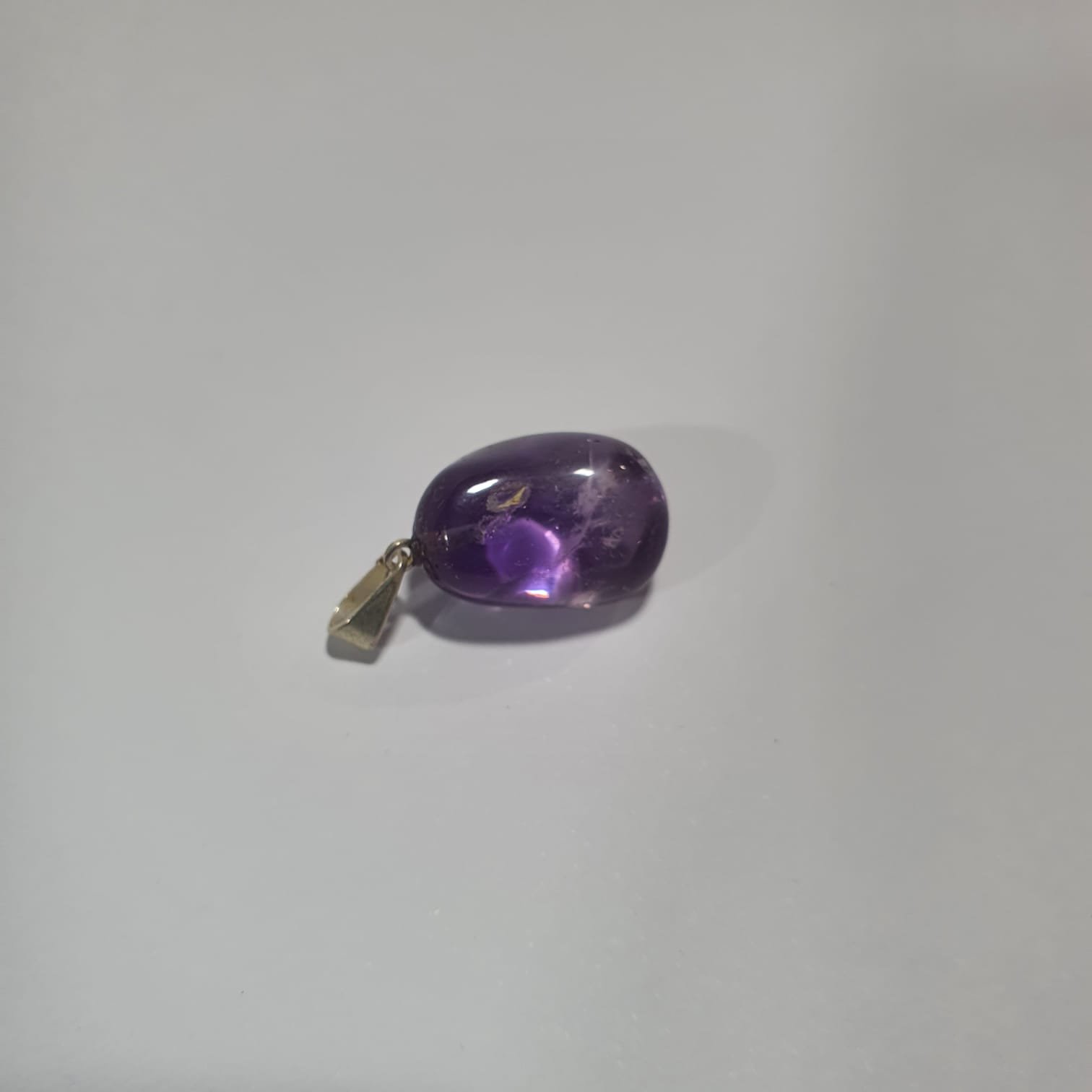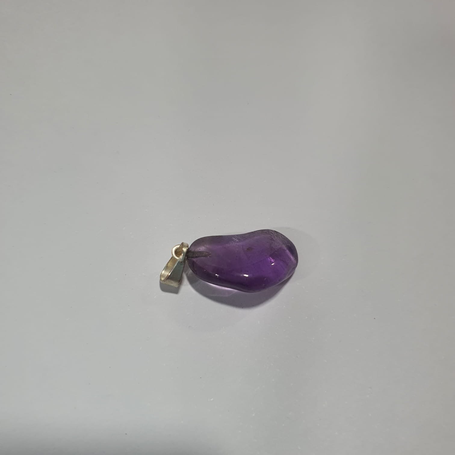 Amethyst is a purple variety of quartz (SiO₂), formed in geodes and cavities of volcanic rocks, where silica-rich fluids crystallize under specific temperature and pressure conditions. Its characteristic violet tones result from traces of iron and natural radiation. In this pendant version, the stones go through a tumbling process, where rough pieces are placed in rotary barrels with abrasives and water. This technique polishes and rounds the surfaces, enhancing luster and emphasizing the gemstone’s natural beauty.