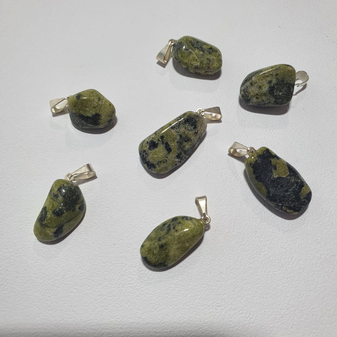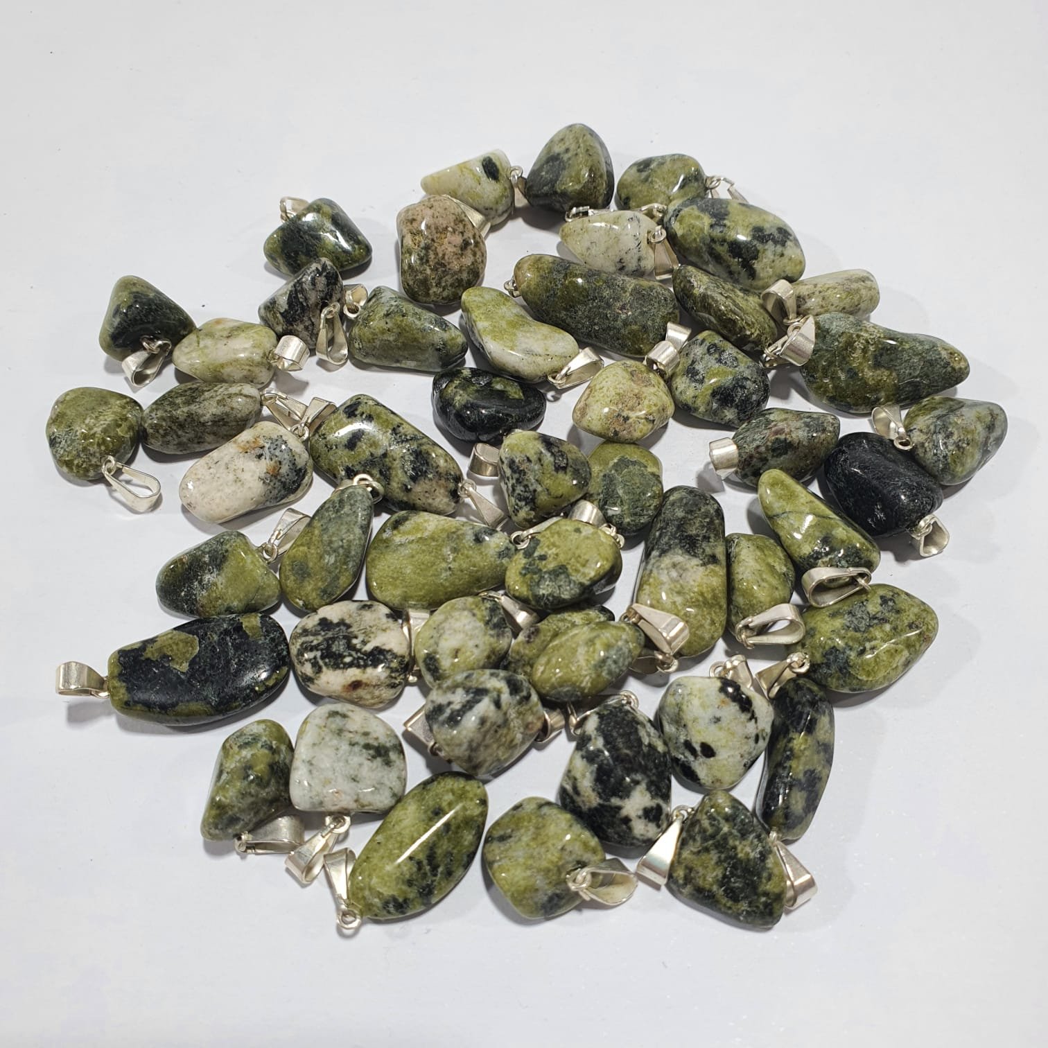 Tumbled Green Jadeite pendants with natural green tones ranging from light to deep shades, enhanced by a smooth and polished finish. Each piece is unique in color and shape, providing exclusivity for every design. Sold in wholesale packs of 25 units, ideal for jewelry, crafts, decoration, and resale.