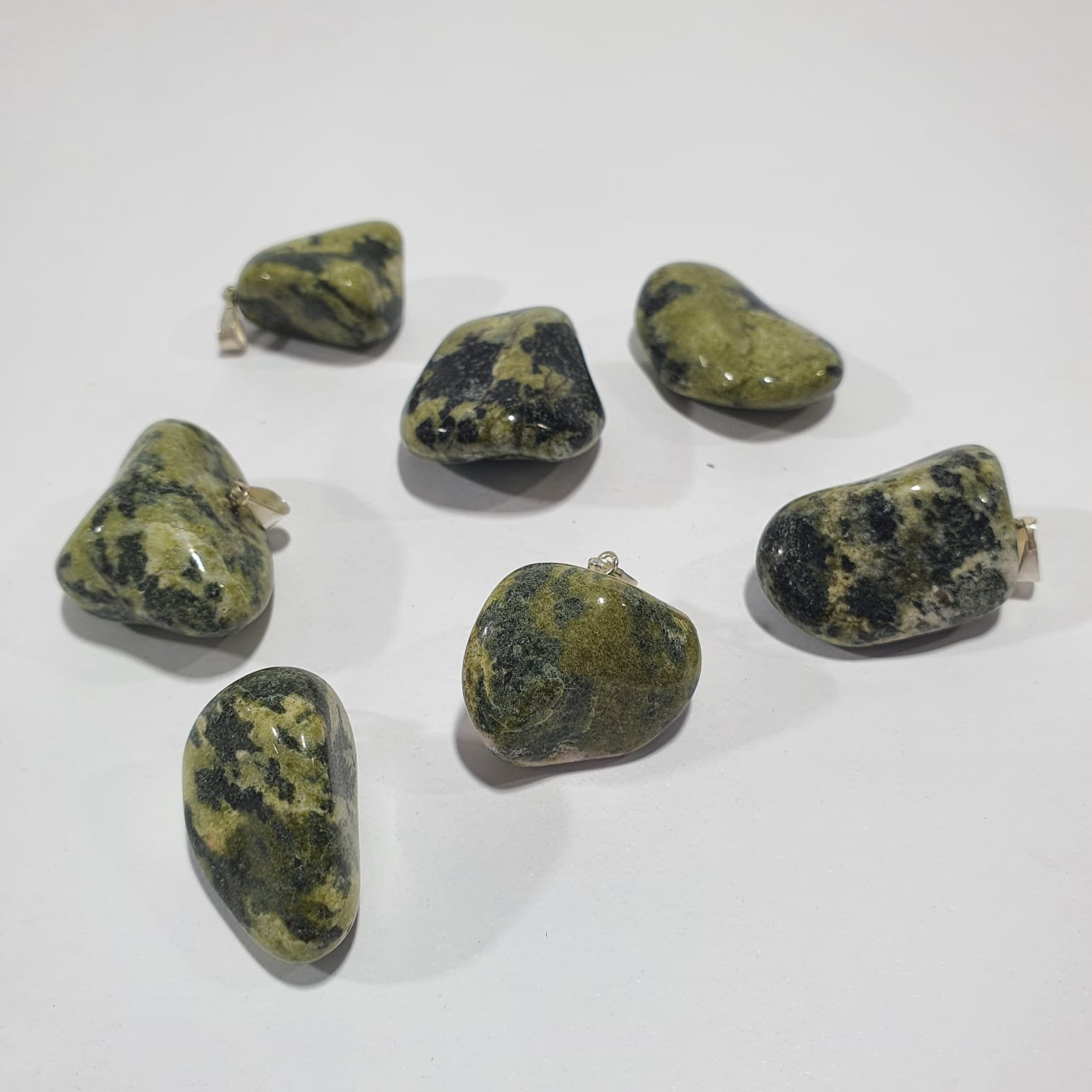 Tumbled Jadeite pendants with natural green shades that range from soft light tones to more intense hues, highlighted by a polished and smooth finish. Each piece is unique in color and shape, ensuring exclusivity for every design. Sold in wholesale packs of 25 units, ideal for jewelry, crafts, decoration, and resale.