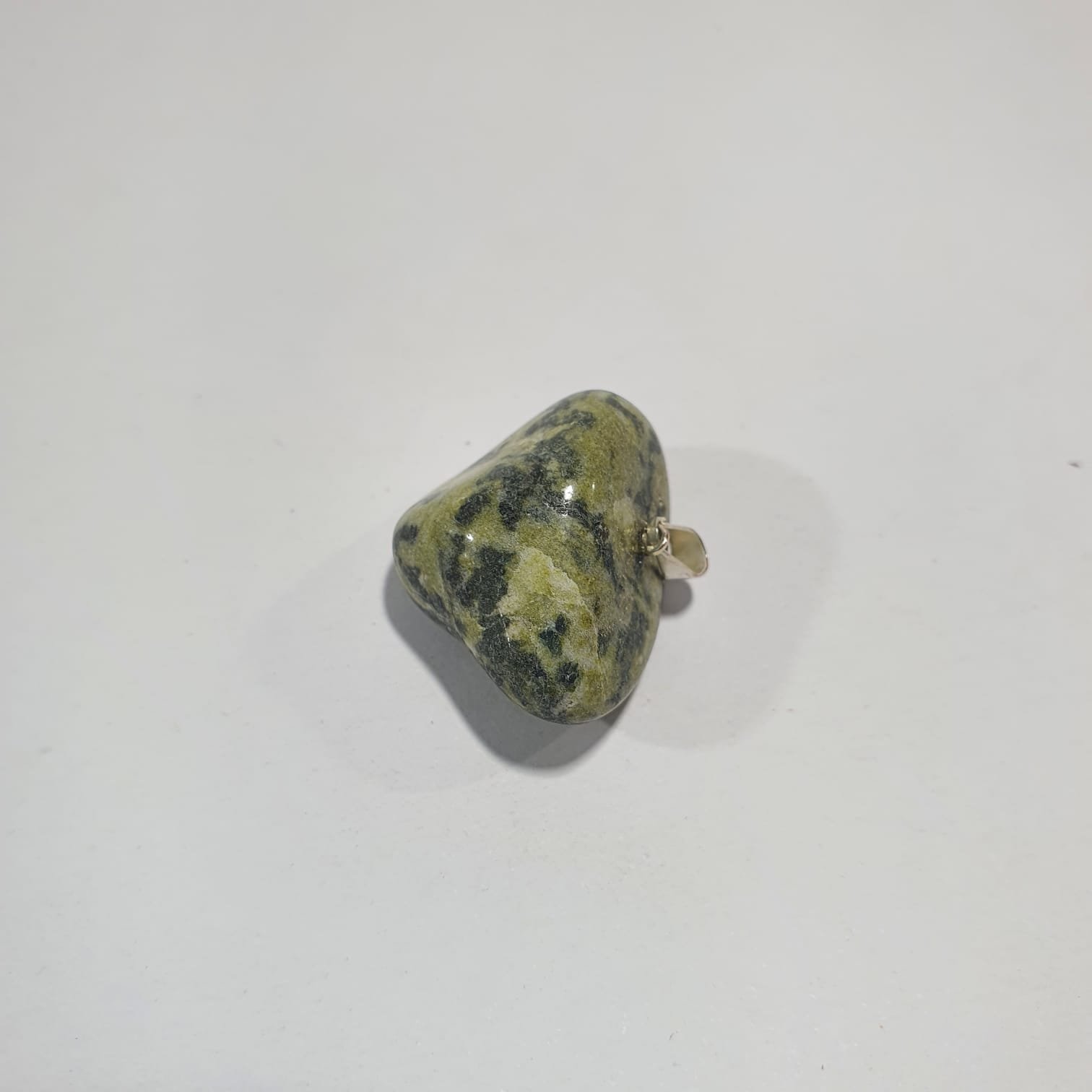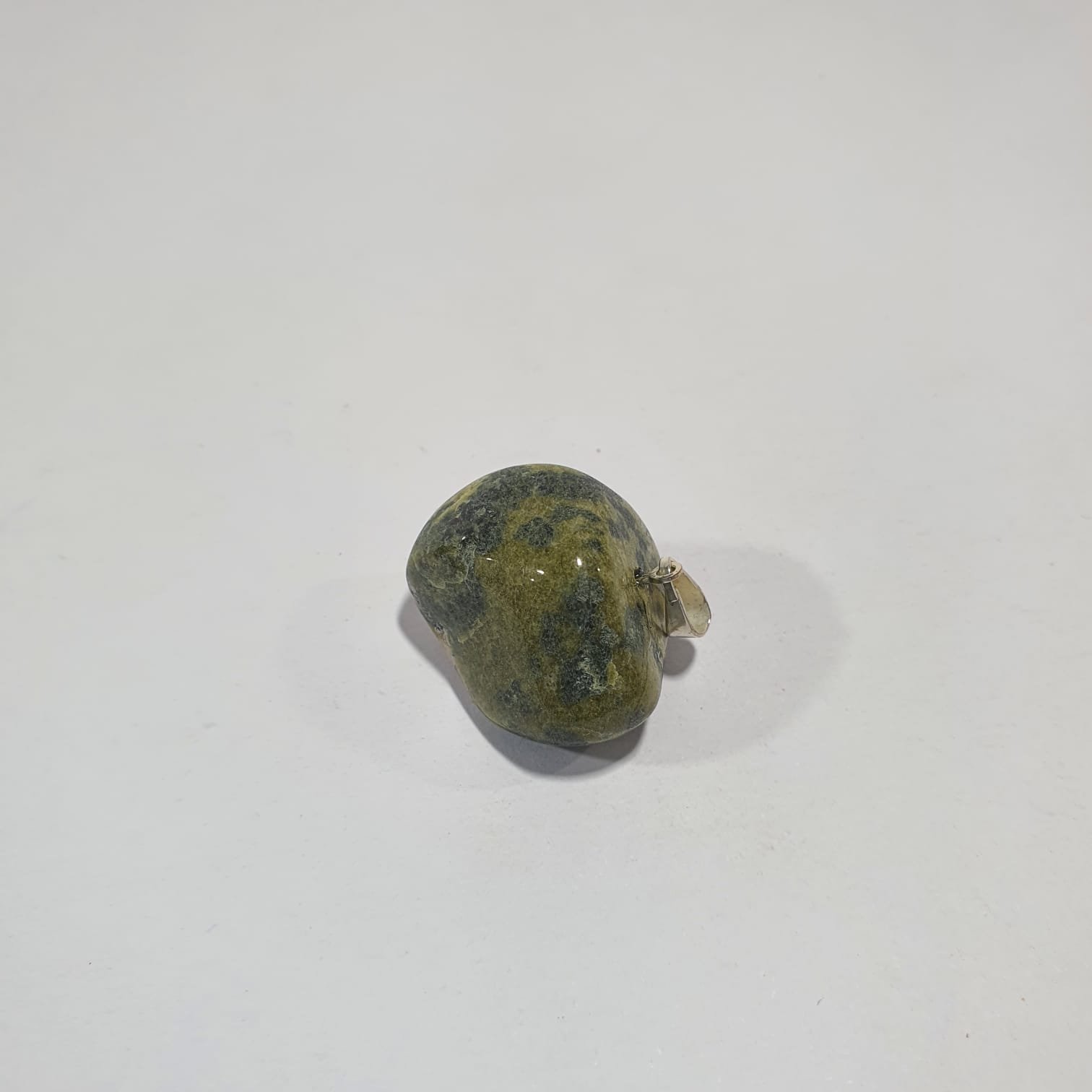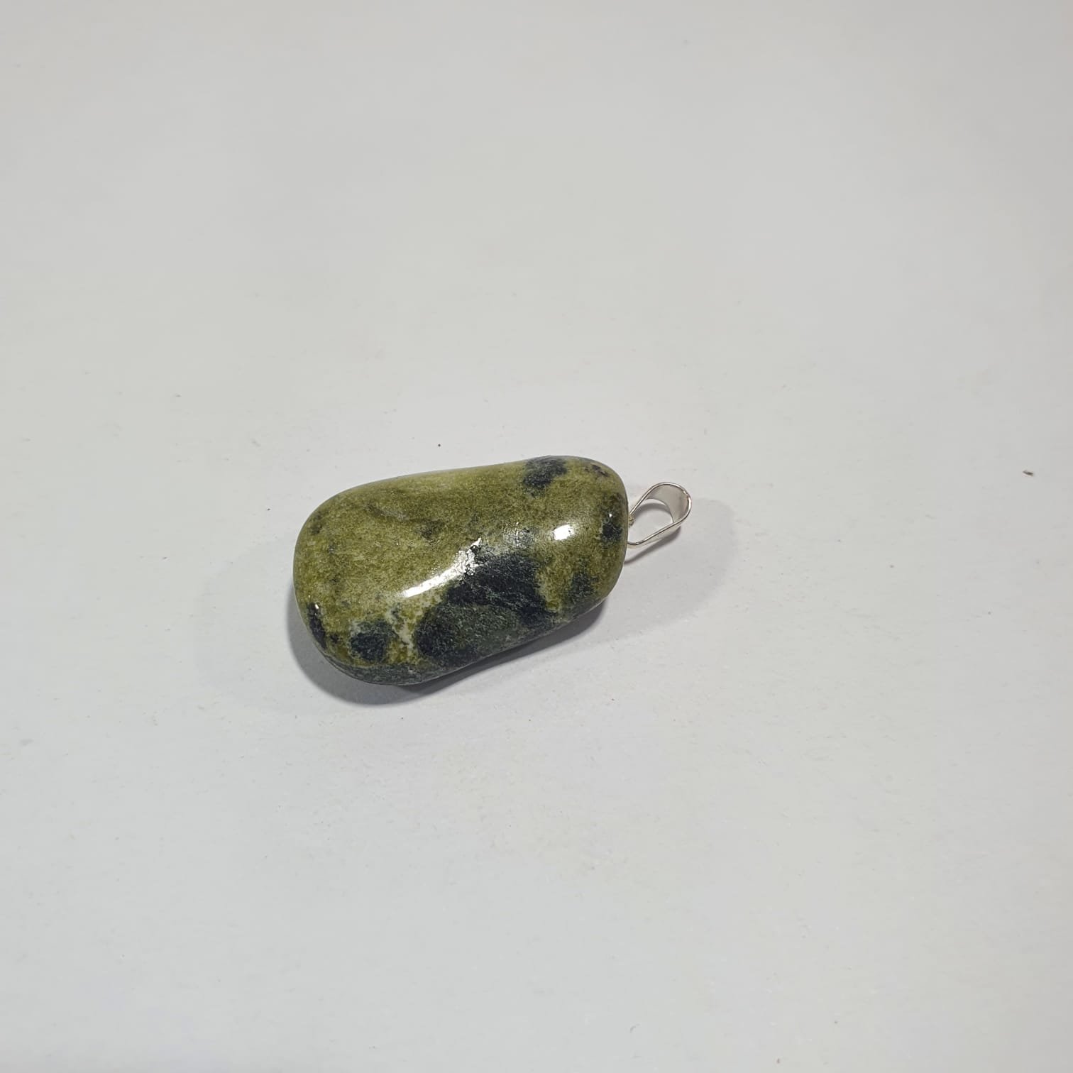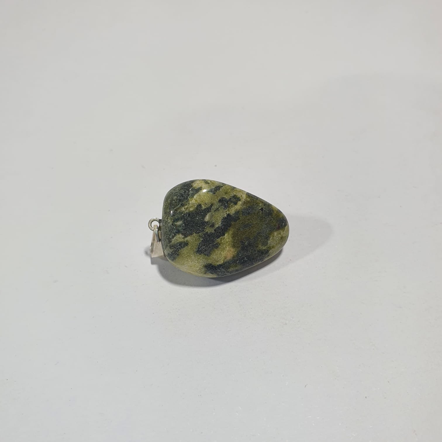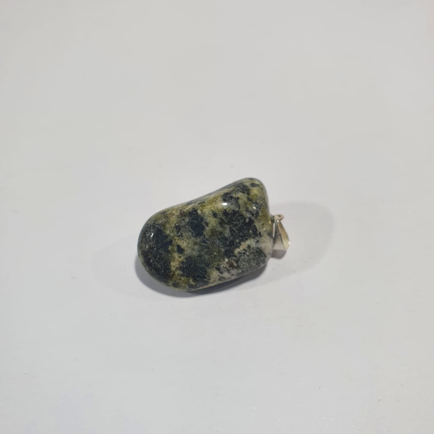 Jadeite is a pyroxene mineral rich in sodium and aluminum, formed in high-pressure metamorphic environments. Its green coloration comes from trace amounts of chromium and iron present during crystallization. In this pendant version, the stones are tumbled, a polishing process where rough minerals are rotated in barrels with abrasives and water. This technique smooths and rounds the edges, enhances natural luster, and emphasizes the vibrant shades of jadeite.