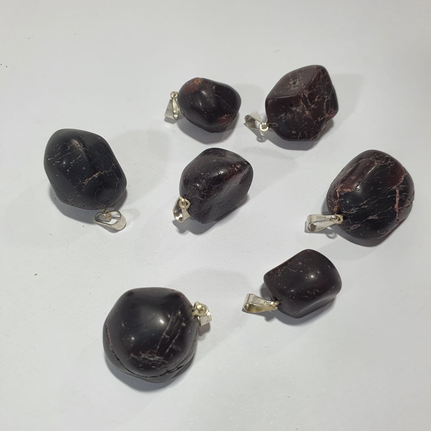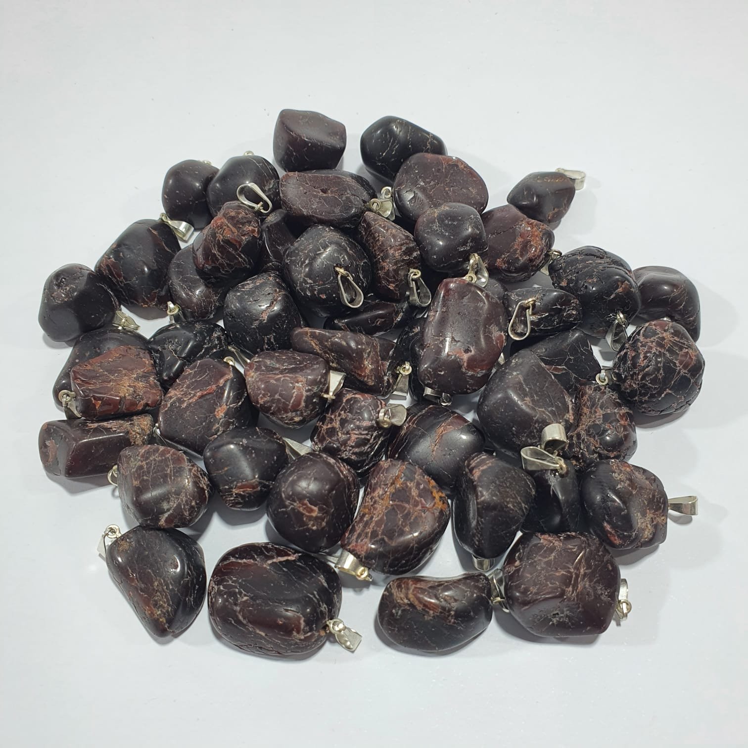 Tumbled Rhodolite Garnet pendants in rich shades of reddish-purple, polished to a smooth and glossy finish that highlights the stone’s natural brilliance. Each piece is unique in color and shape, ensuring exclusivity in every creation. Sold in wholesale packs of 25 units, ideal for jewelry, crafts, decoration, and resale.