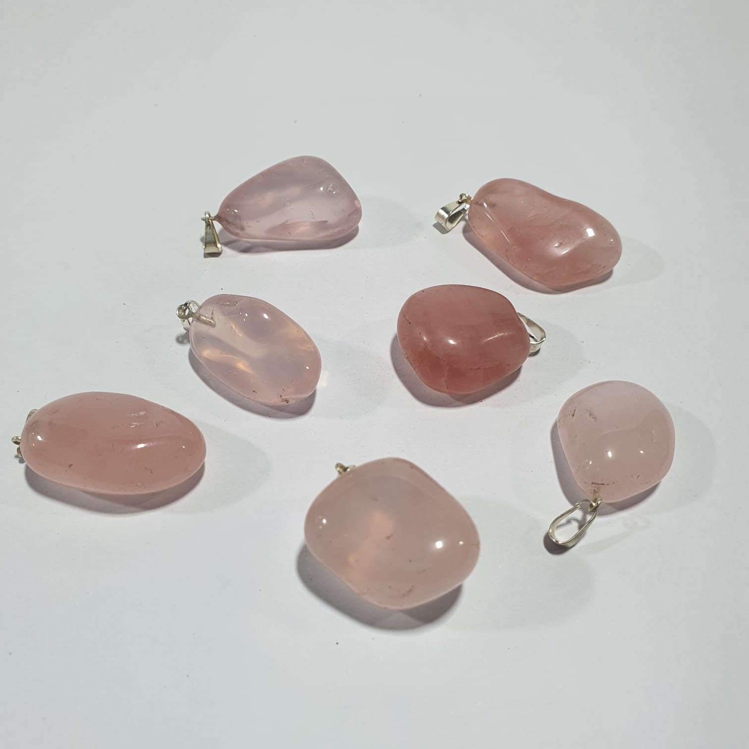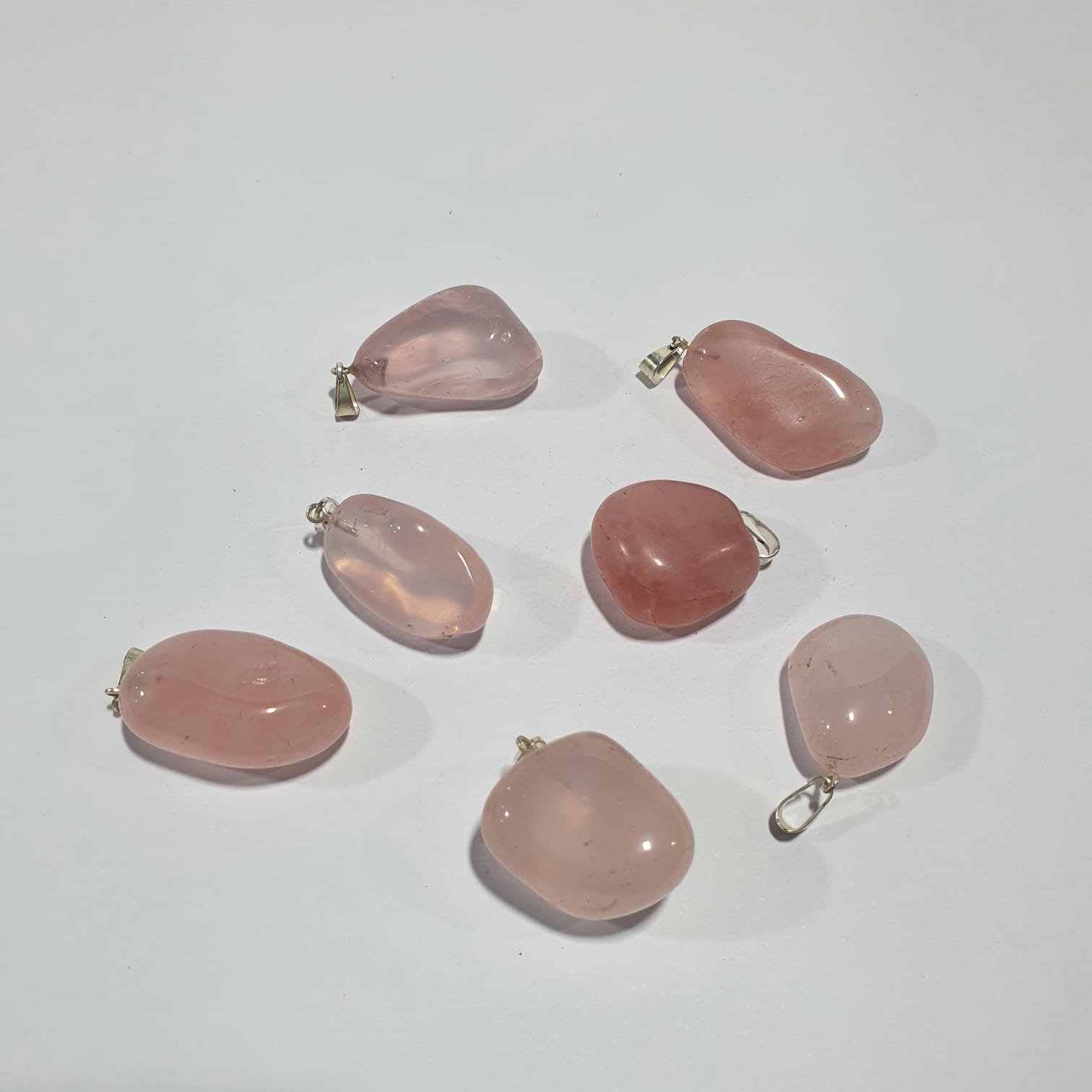 Tumbled Rose Quartz pendants in soft pink shades, polished to a smooth and shiny finish that highlights the natural beauty of the stone. Each piece is unique in color and shape, making every pendant exclusive. Sold in wholesale packs of 25 units, ideal for jewelry, crafts, decoration, and resale.