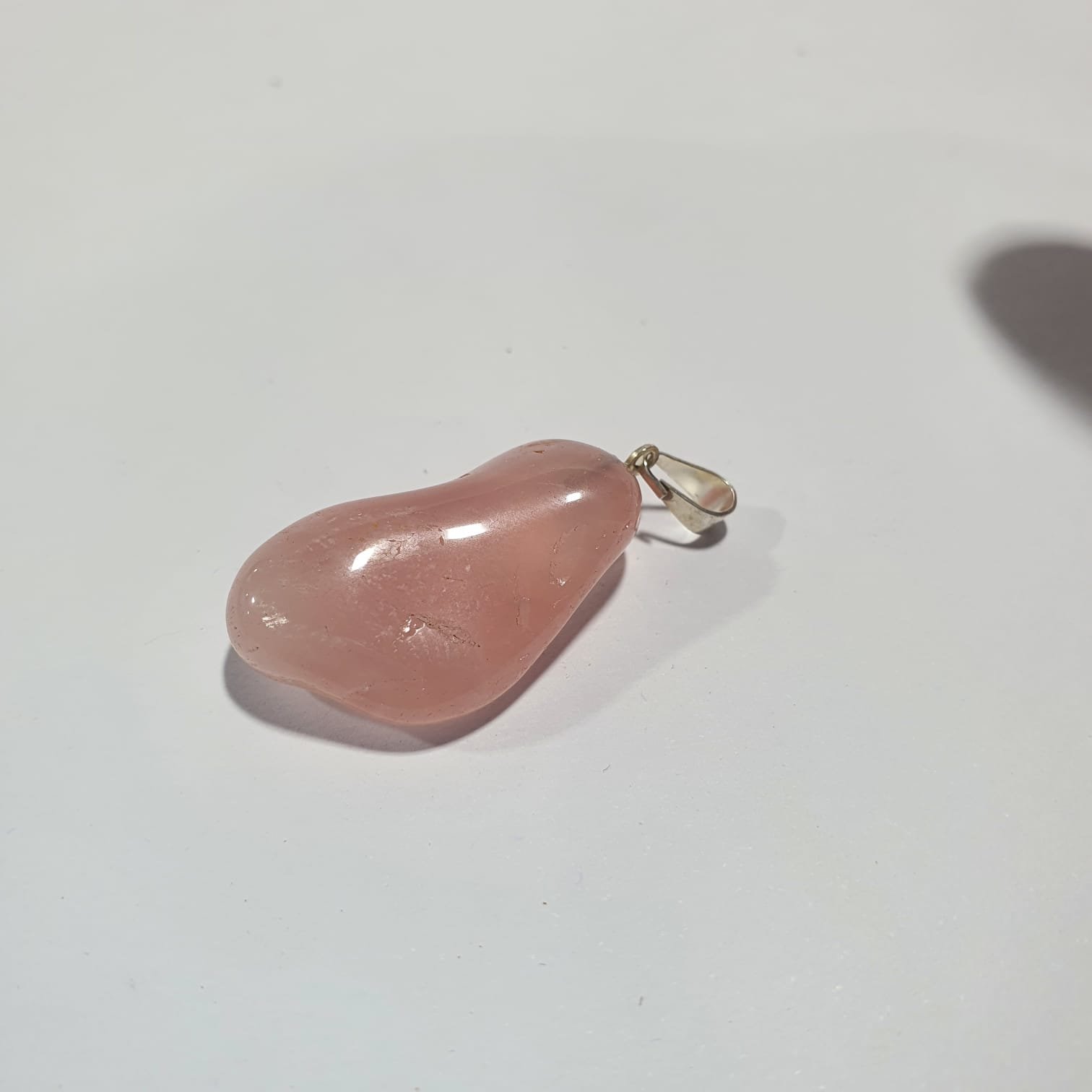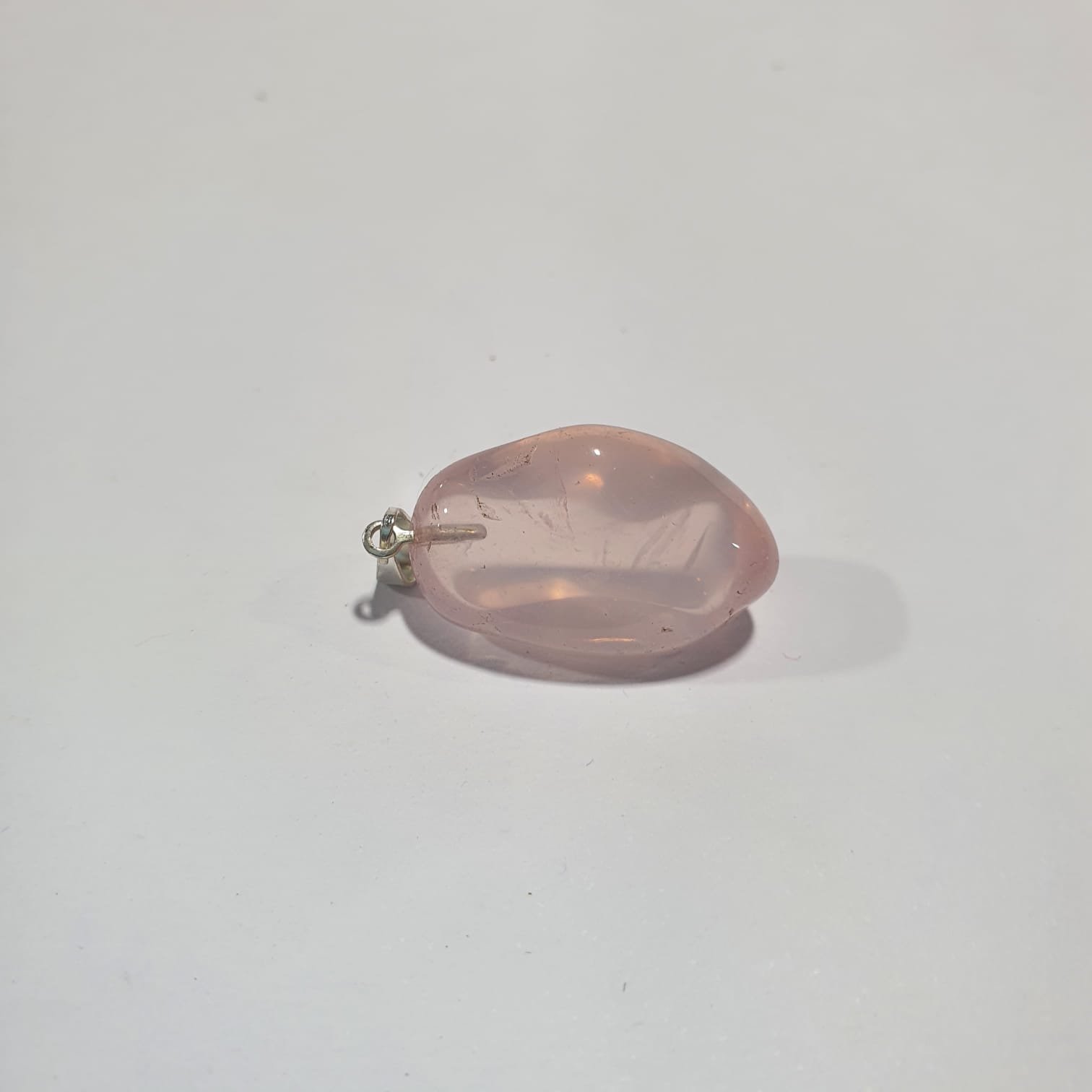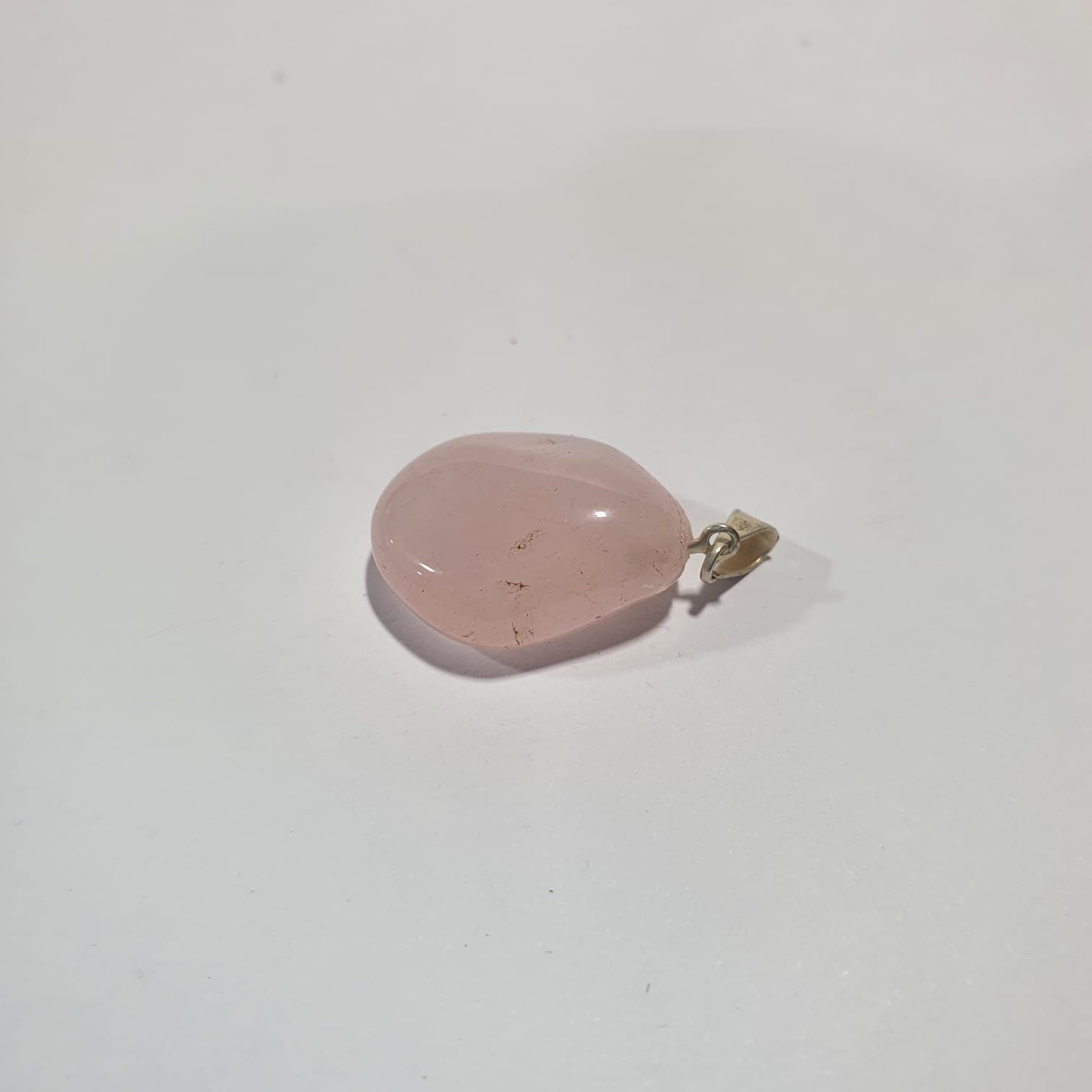 Rose Quartz is a variety of quartz composed mainly of silicon dioxide. Its pink coloration is caused by trace amounts of titanium, iron, or manganese during crystallization. In this pendant version, the stones are tumbled, a polishing technique in which rough minerals are rotated in barrels with abrasives and water. The process smooths the surfaces, rounds the edges, and enhances the natural luster, making rose quartz particularly attractive for jewelry.