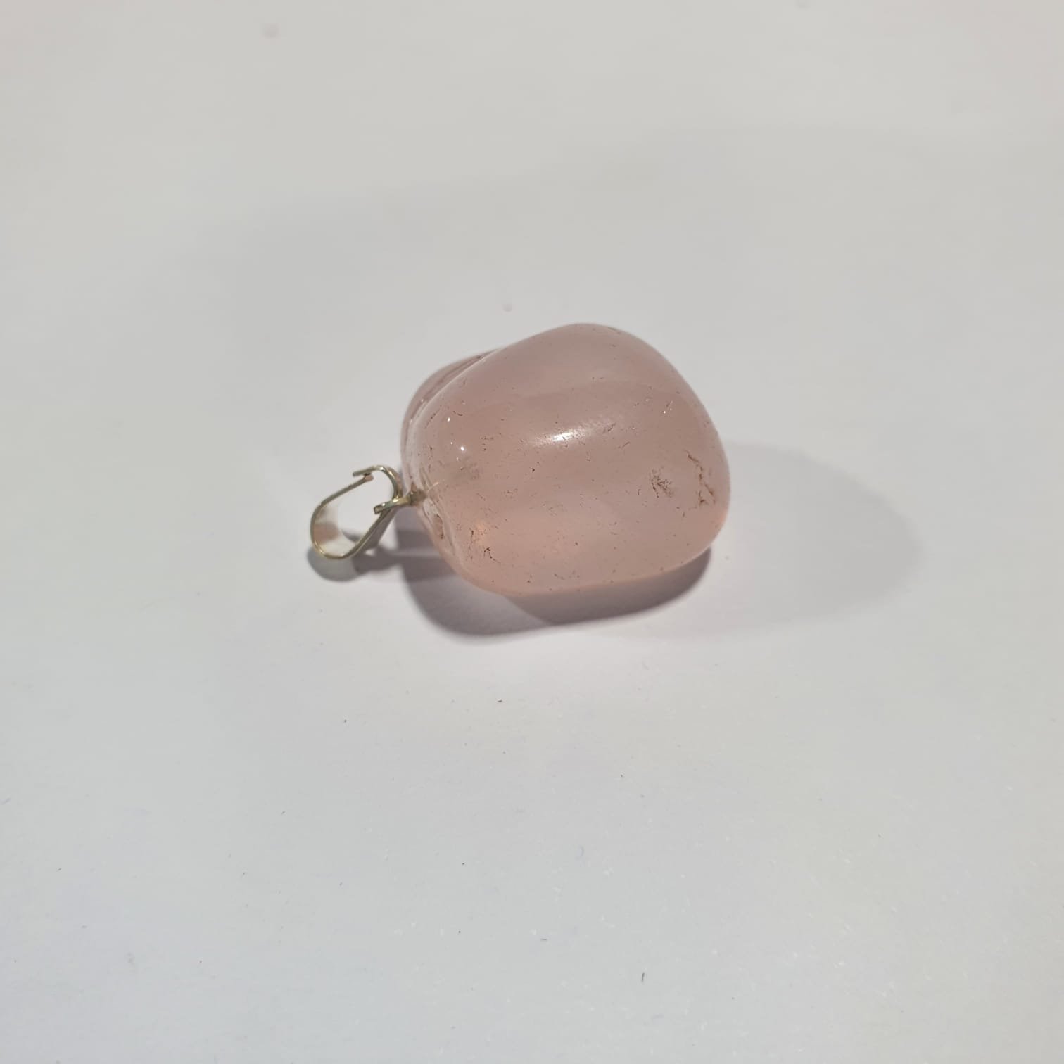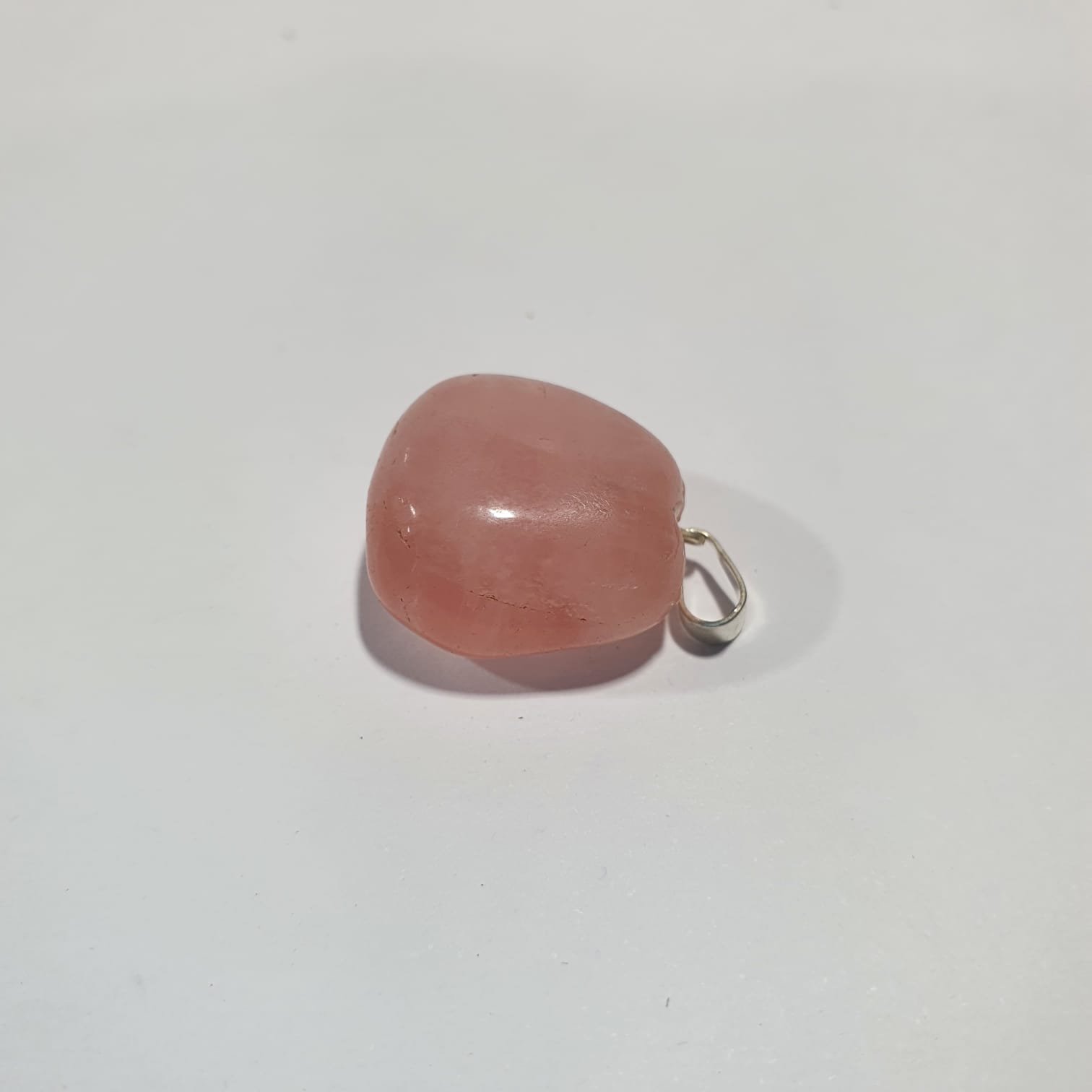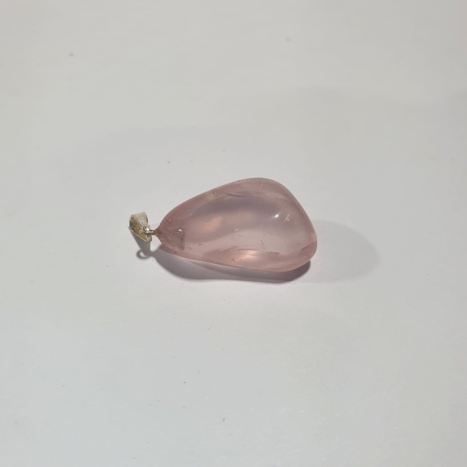 Rose Quartz is a variety of quartz composed mainly of silicon dioxide. Its pink coloration is caused by trace amounts of titanium, iron, or manganese during crystallization. In this pendant version, the stones are tumbled, a polishing technique in which rough minerals are rotated in barrels with abrasives and water. The process smooths the surfaces, rounds the edges, and enhances the natural luster, making rose quartz particularly attractive for jewelry.