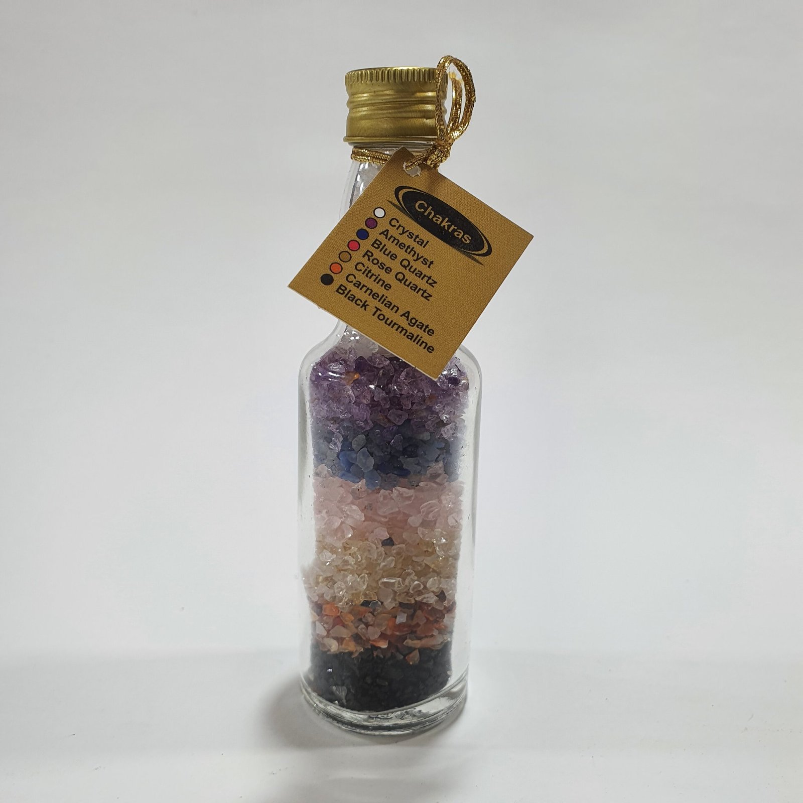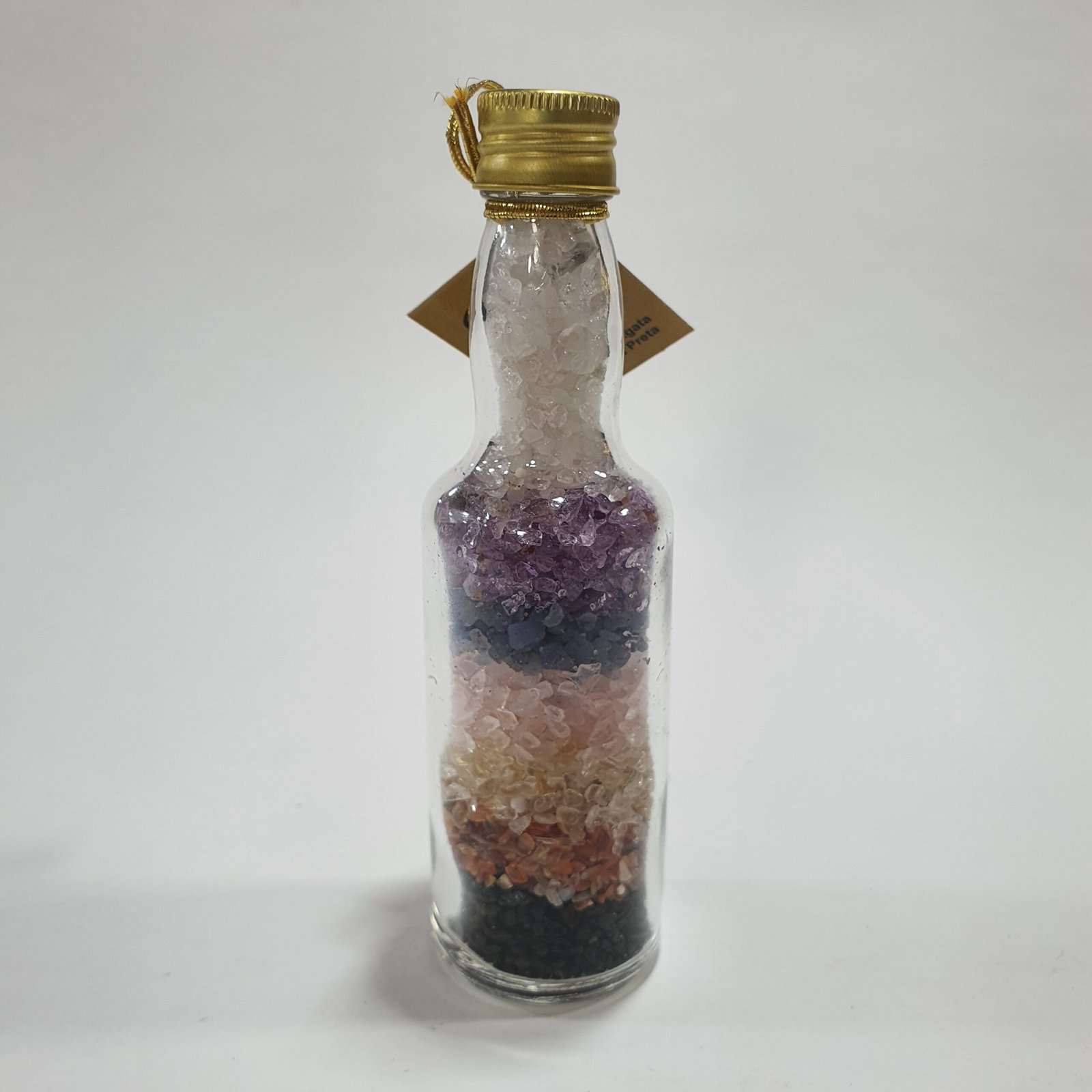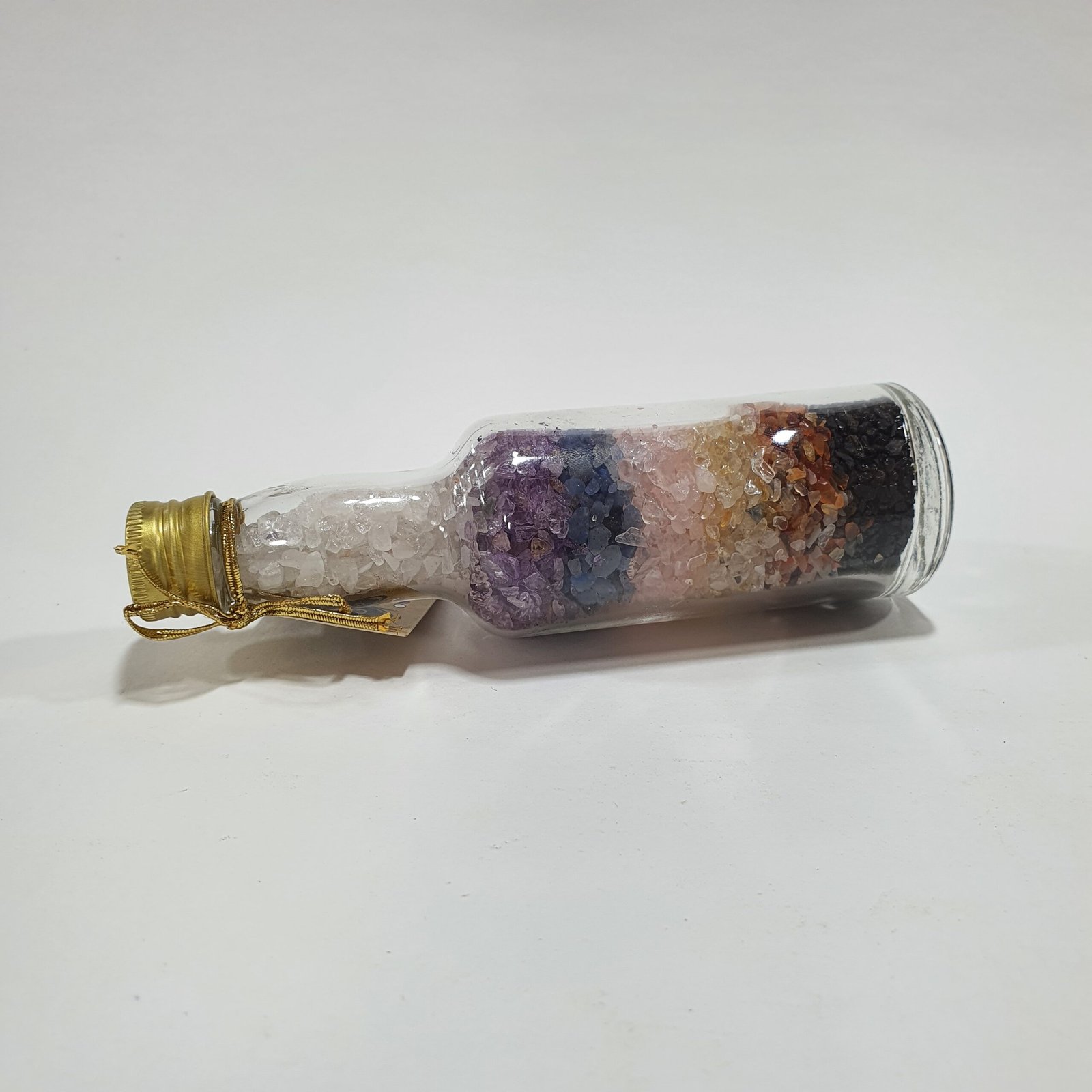 Transparent glass bottle that showcases the natural beauty of the stones.