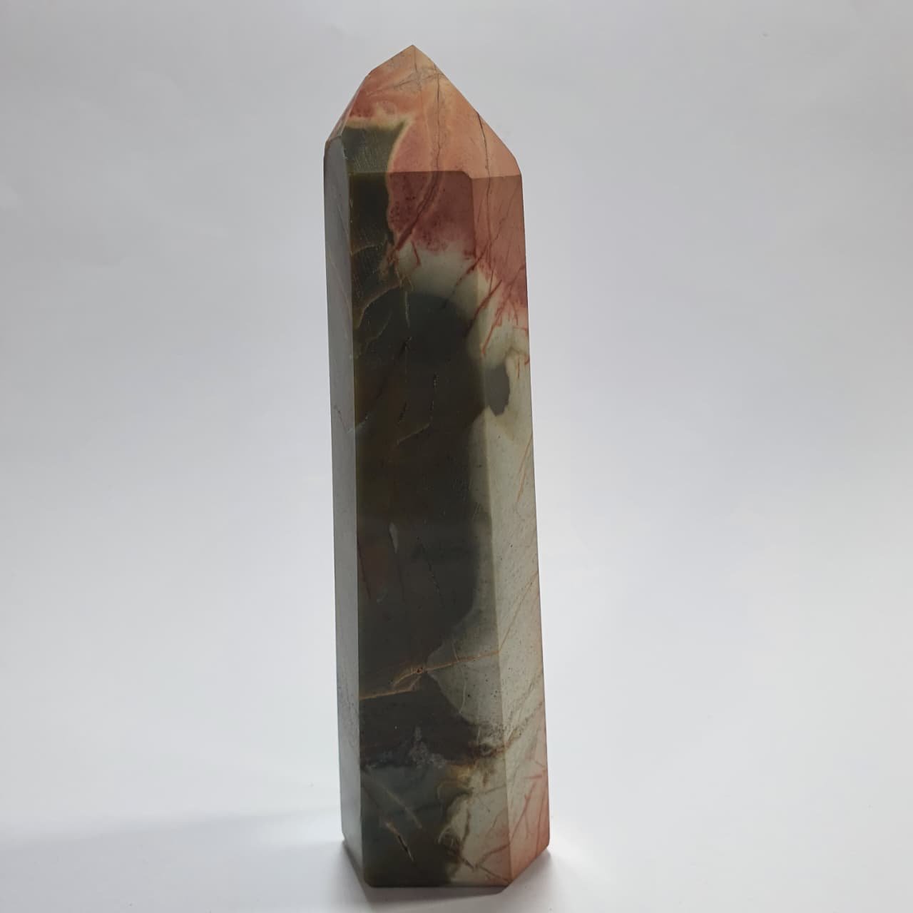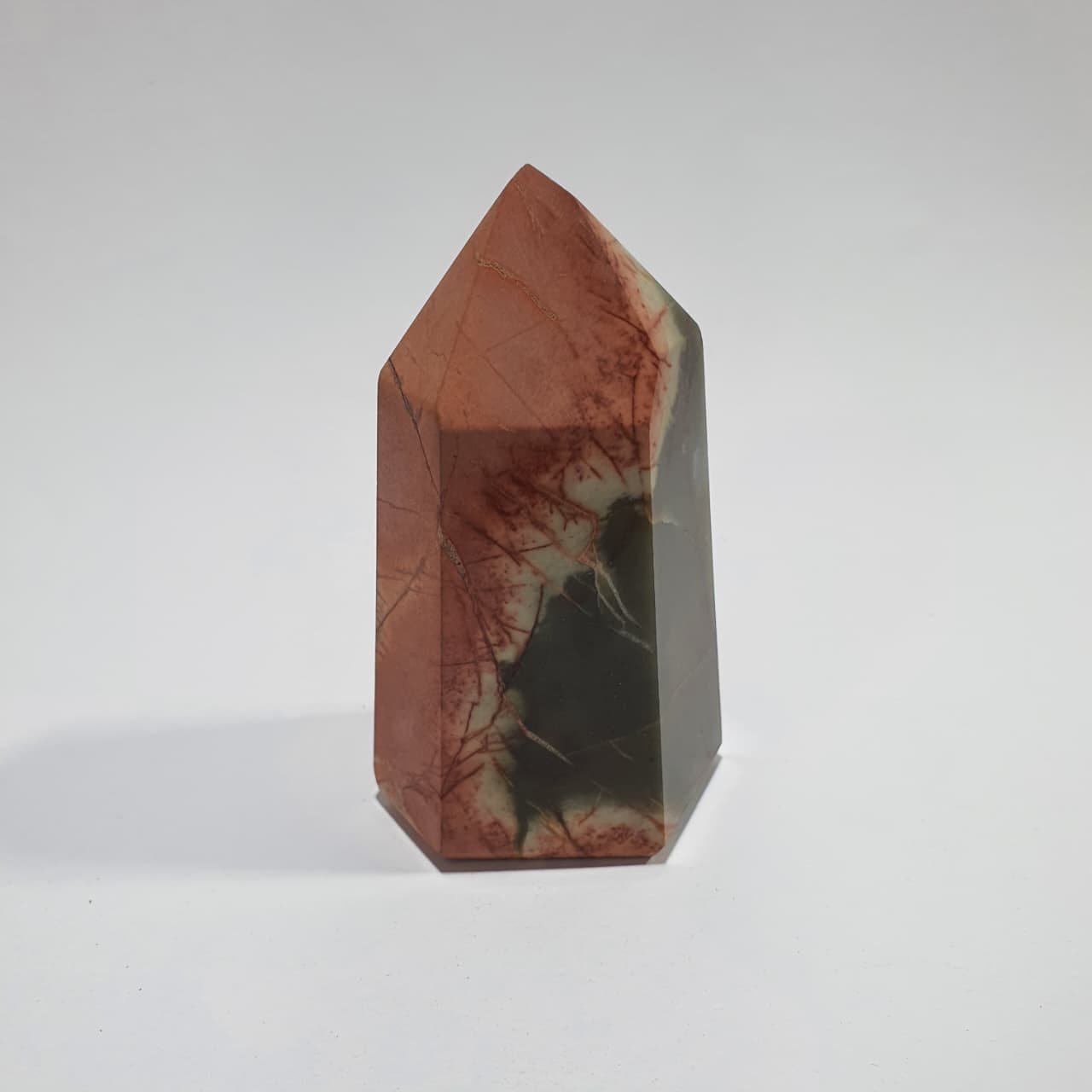 Polychrome Jasper is a variety of chalcedony, a microcrystalline form of quartz (SiO₂), formed through the consolidation of silica-rich sediments over millions of years. The stone’s multicolored patterns are created by the presence of iron oxides and other trace minerals during its geological formation. Polished points are shaped from rough material, then cut, ground, and polished to highlight the stone’s natural colors and distinctive patterns.