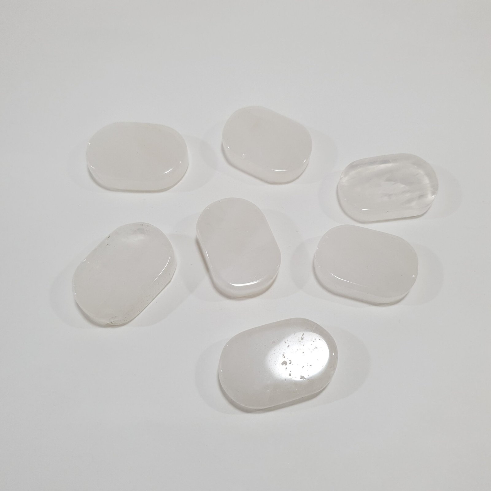 White Quartz forms when silicon dioxide crystallizes in hydrothermal veins or pegmatites, producing stones with a milky, translucent appearance. Polishing enhances the natural texture and smooth finish of each piece.