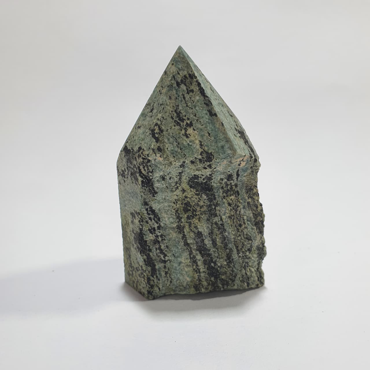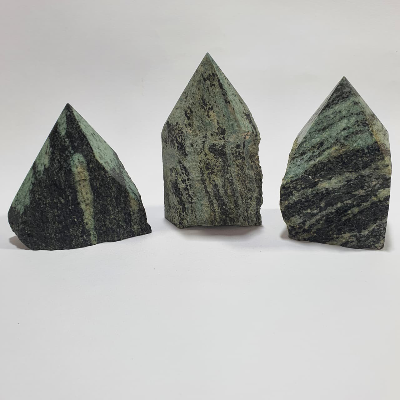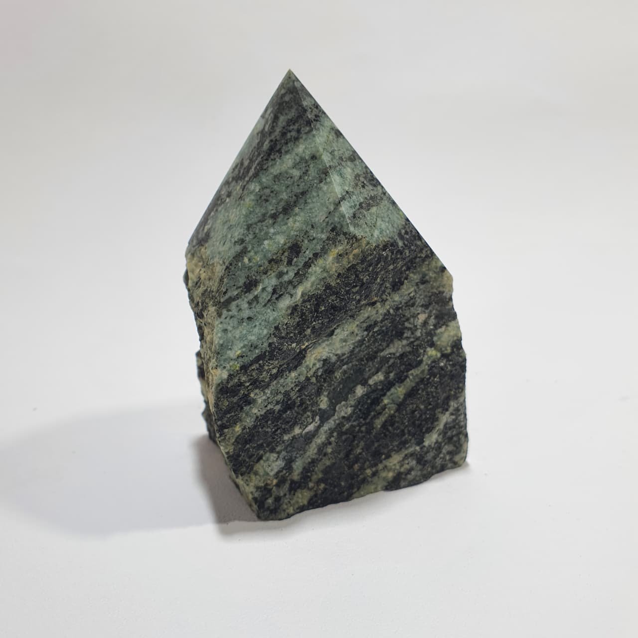 Chrysotile is a fibrous variety of serpentine (Mg₃Si₂O₅(OH)₄) formed in ultramafic rocks through hydrothermal metamorphism. The semi polished points are crafted by polishing the tip to reveal color and texture while leaving the base in its natural state, maintaining the contrast between refined and raw surfaces.