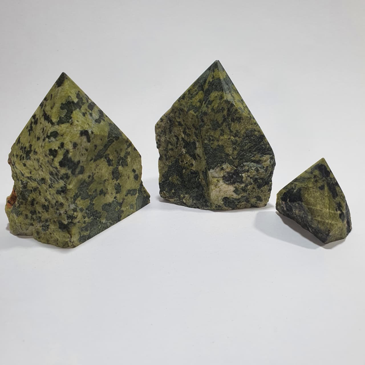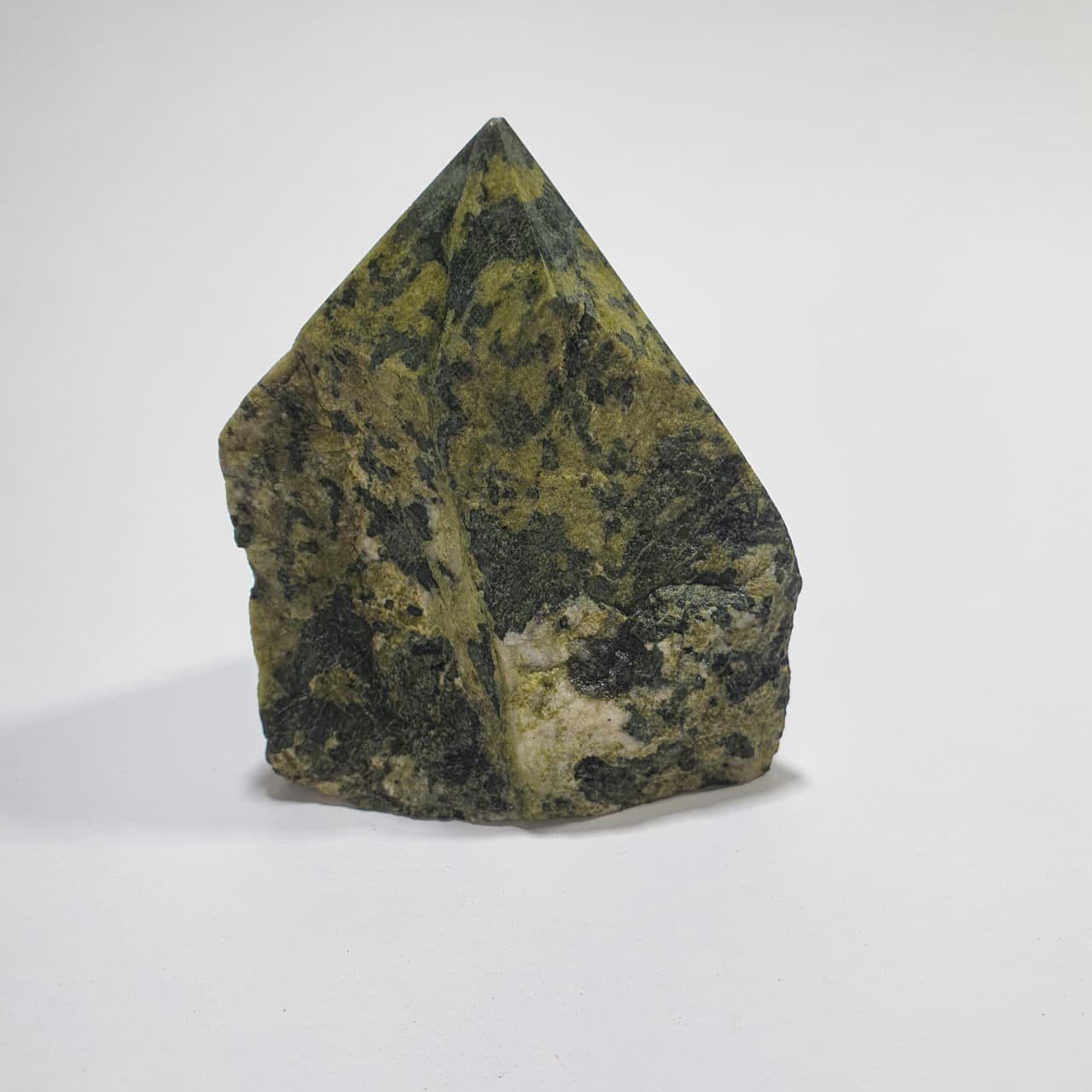 Jadeite (NaAlSi₂O₆) is a pyroxene mineral that forms under high-pressure, low-temperature metamorphic conditions, typically in subduction zones. It is valued for its durability and rich green shades, often appearing with mottled or veined patterns. Semi polished points highlight these visual features by polishing the tip to a smooth finish, while preserving the natural base for contrast.