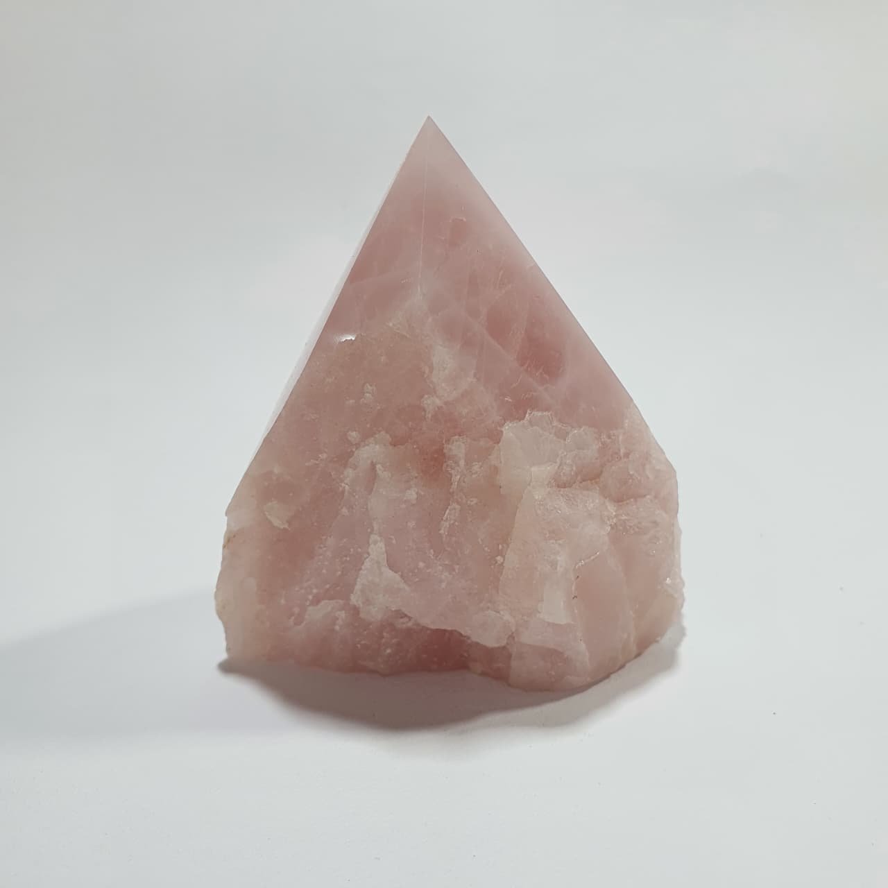 Rose Quartz is a macrocrystalline variety of quartz (SiO₂) colored by trace amounts of titanium, iron, or manganese. Semi polished points are crafted with a polished tip that highlights the stone’s delicate translucency, while the natural base reflects its original growth environment.